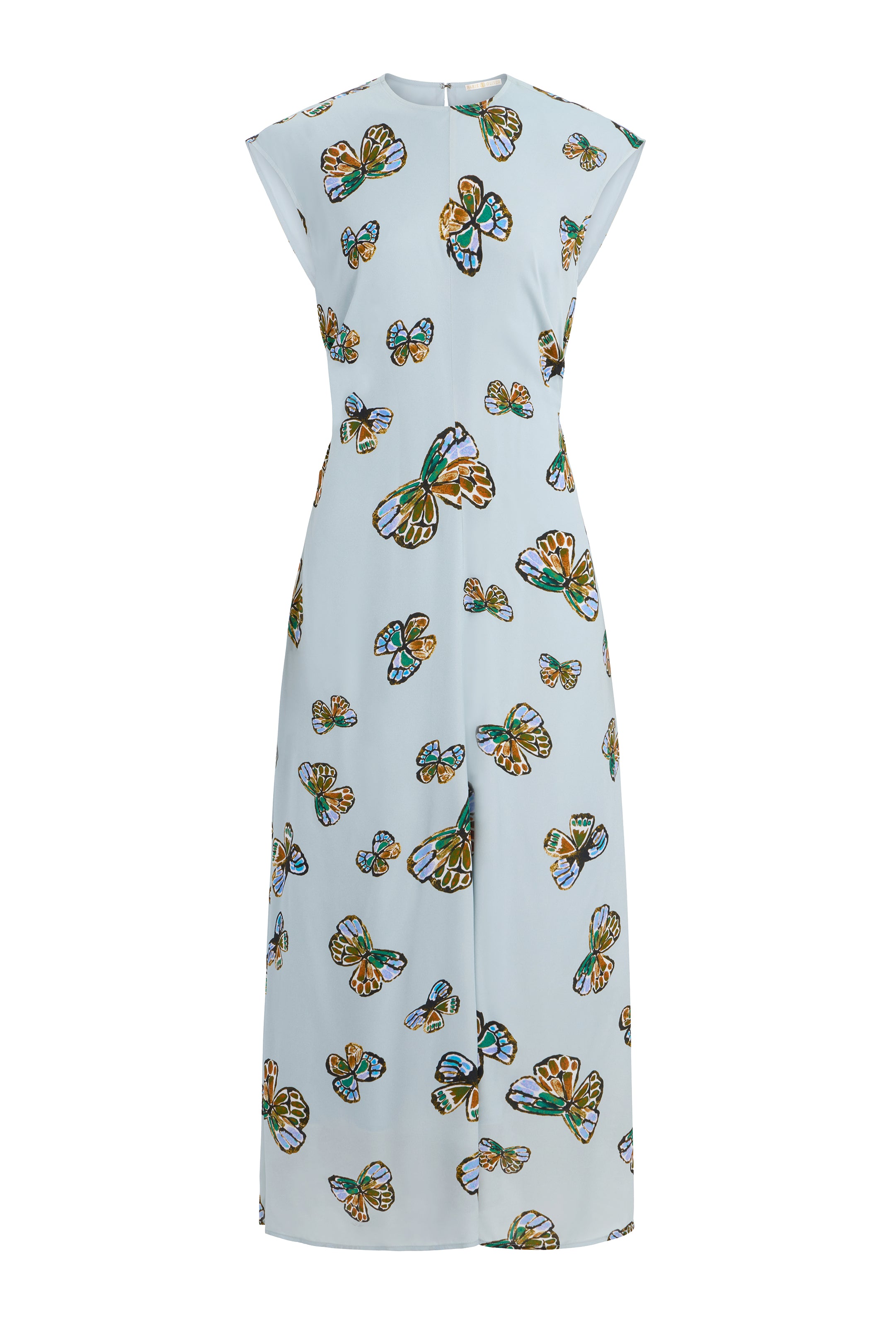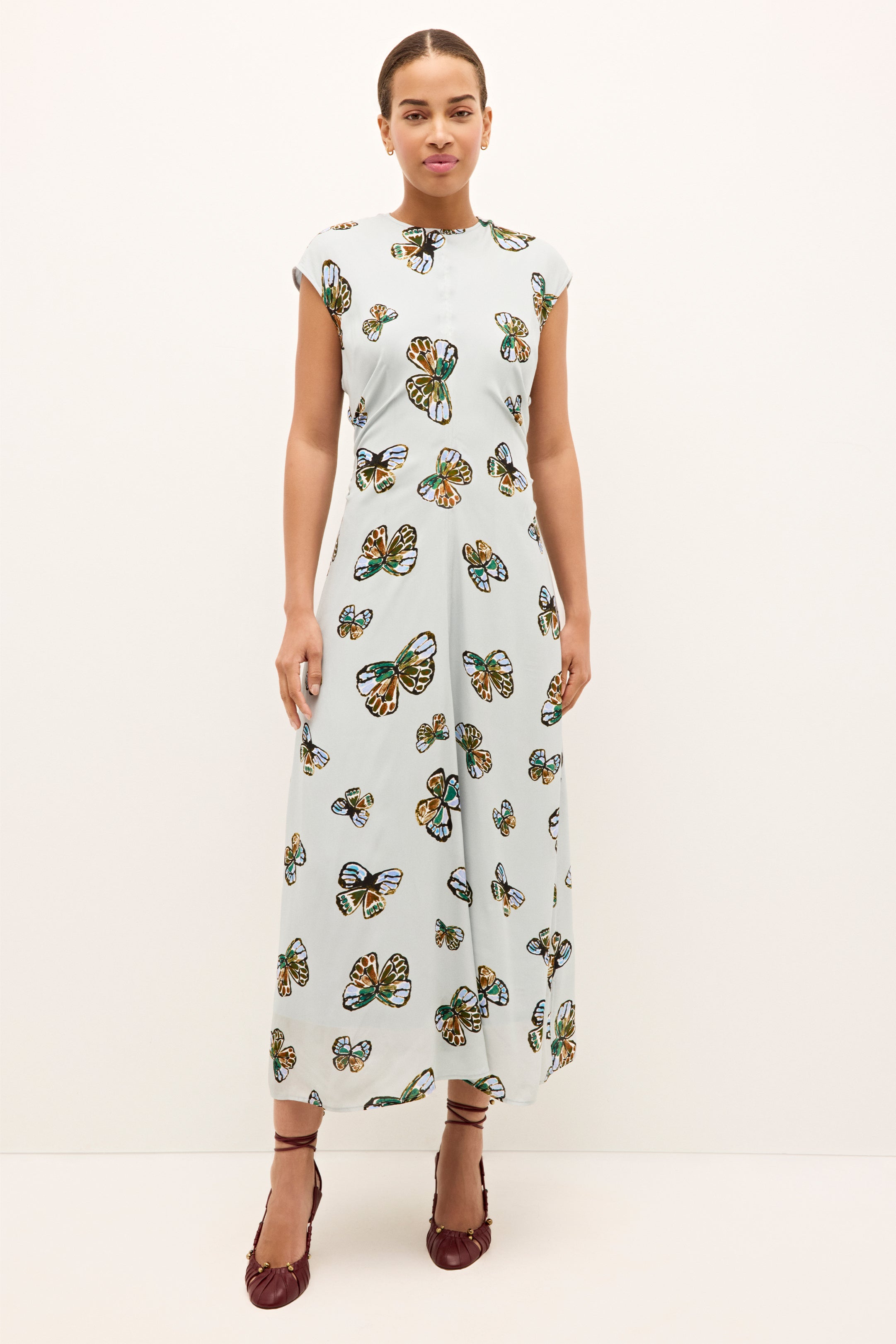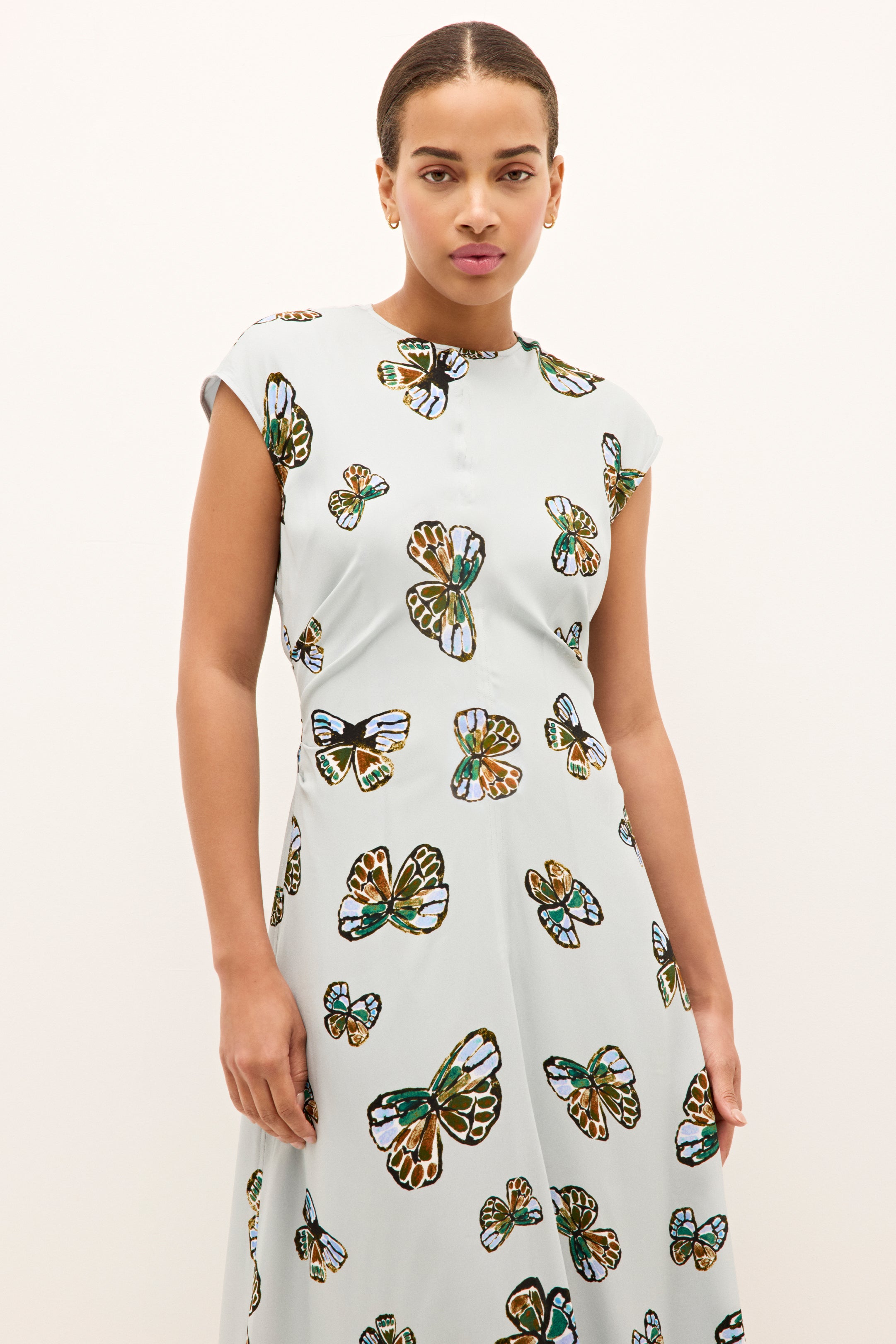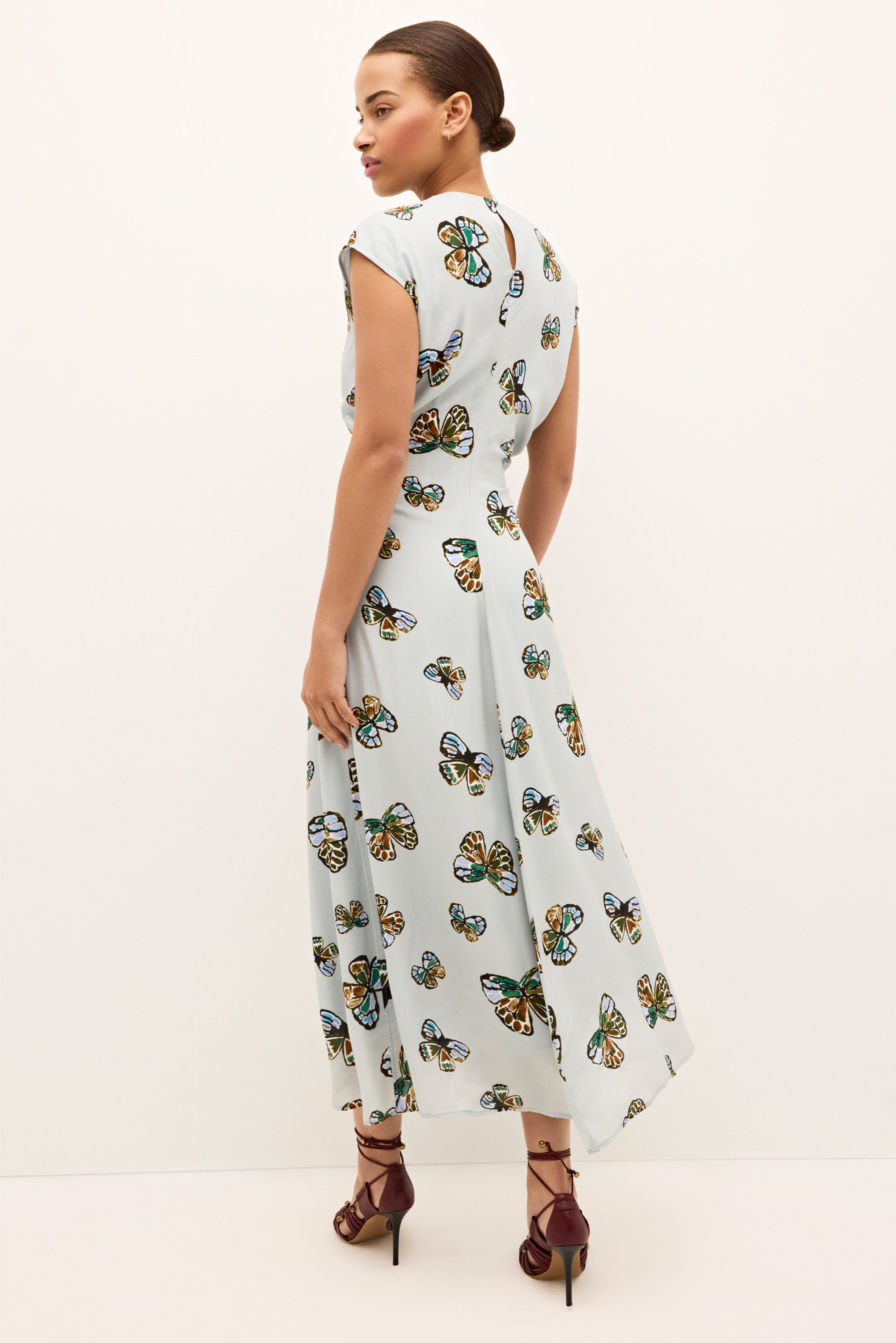 Cut on the bias with pleated waist detailing and a center-back keyhole opening, this sophisticated maxi dress is designed to bridge summer-to-fall gap. Our lighthearted Adonis print adds a dose of playfulness with its kaleidoscope of butterflies set against a sky-blue background.
