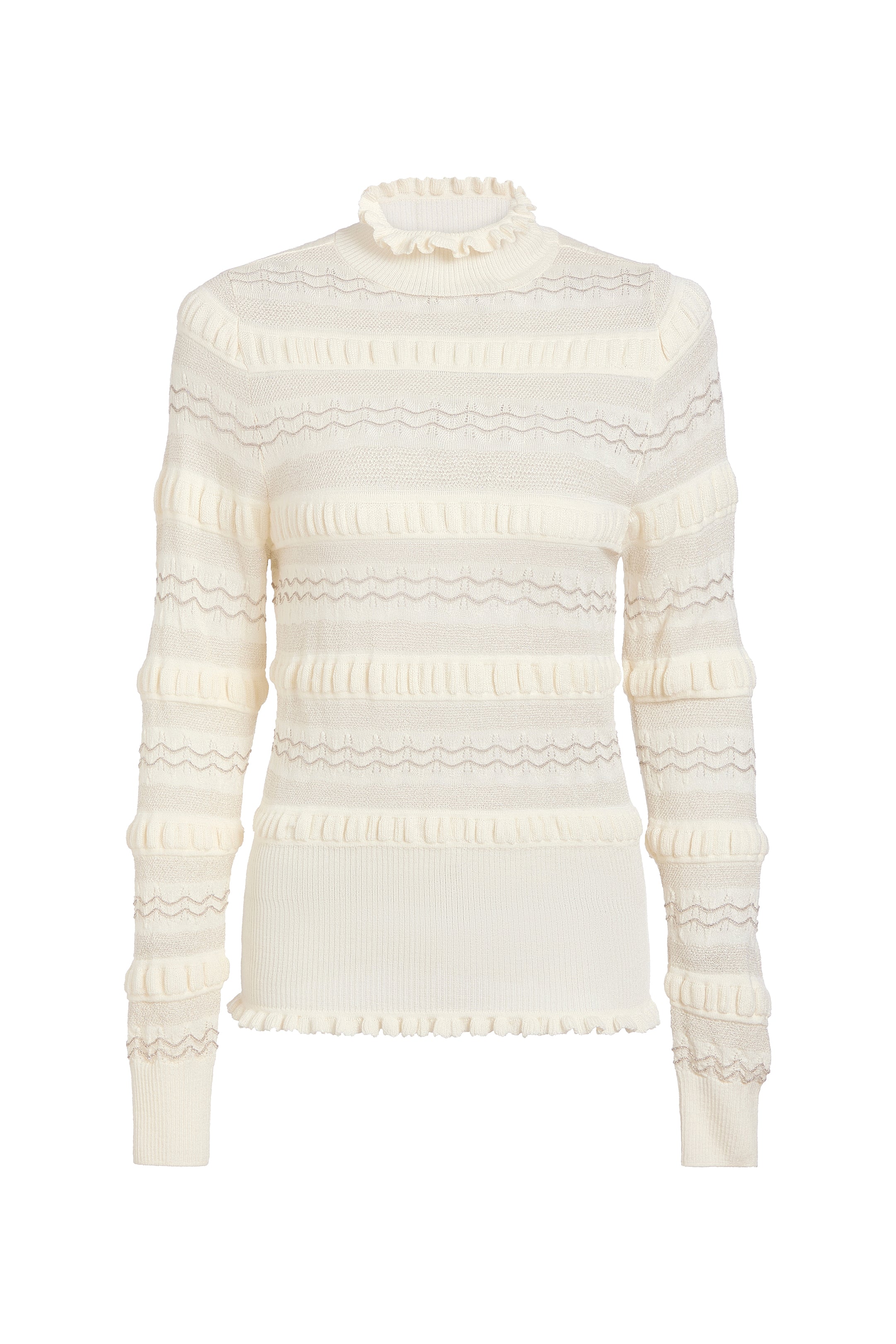 The utilitarian figure-skimming turtleneck gets a feminine upgrade with allover folded ruffle details, plus a delicate pointelle knit woven with metallic yarn for a subtle shimmer. Adison is pictured here in Ivory and is styled back to our Crawford skirt in matching vegan leather for a chic head-to-toe white look.