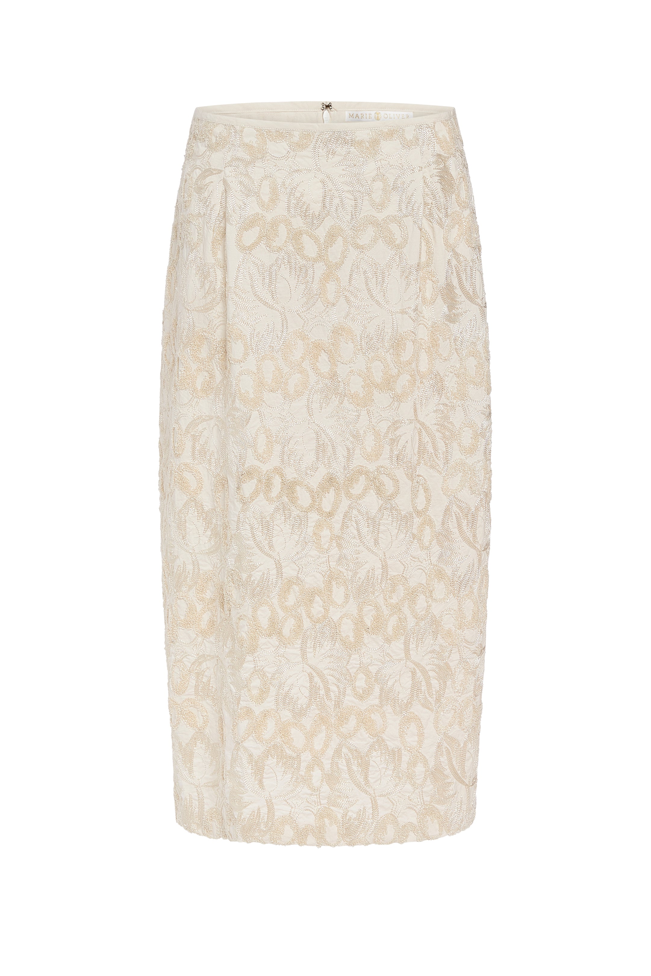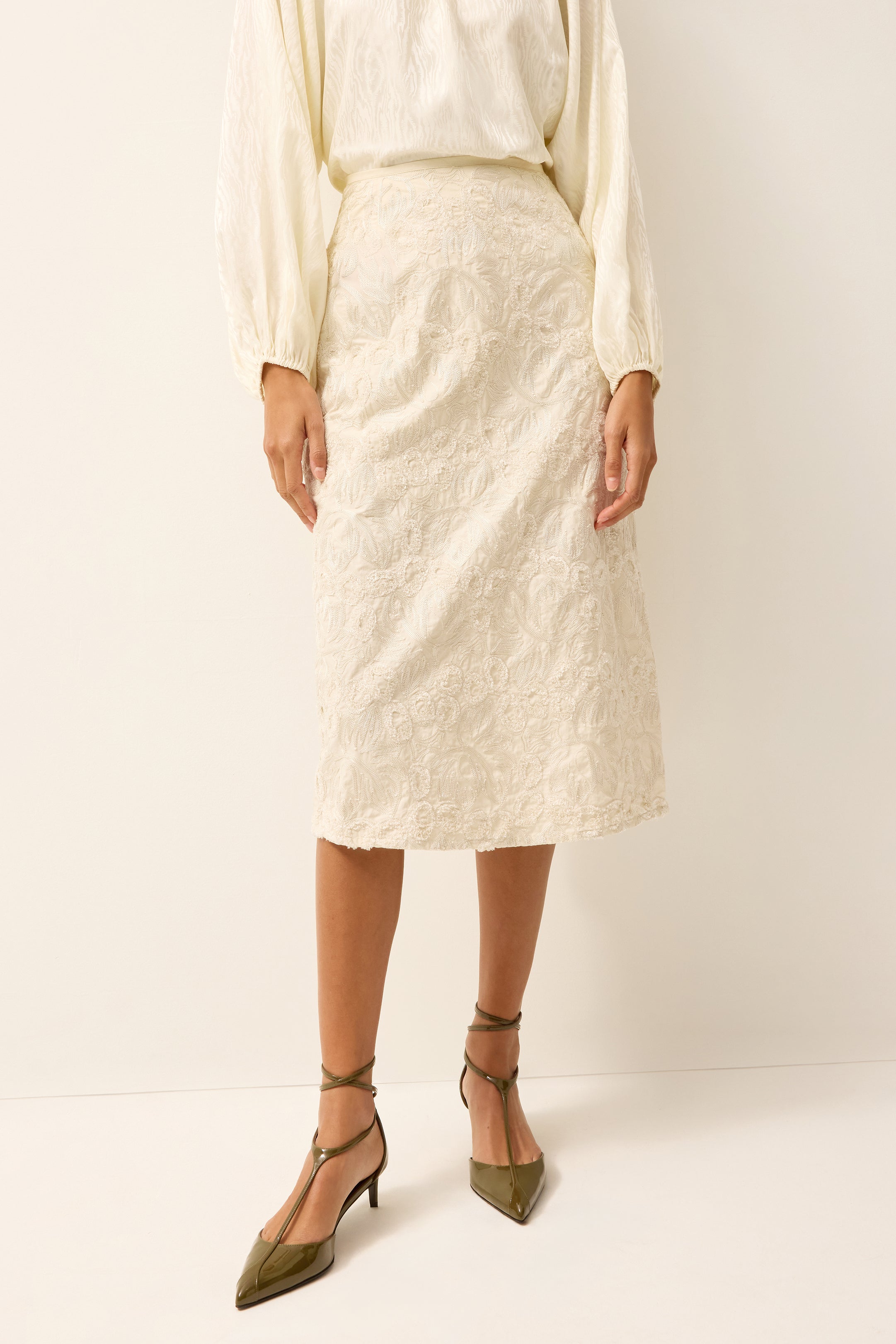 With a ladylike silhouette, this lace sheath skirt in warm winter white brightens dreary days and adds timeless sophistication to your seasonal wardrobe. Amplify the chic seasonal aesthetic and go tonal, pairing the refined skirt with our beautifully draped Oryan blouse in Blanc.