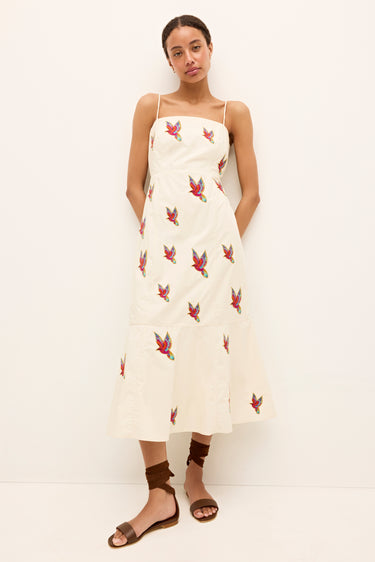 A classic sundress with thin, adjustable tie straps, Birdie is made from a lightweight, cream-colored cotton, and animated by a rainbow flock of embroidered appliqué parrots.