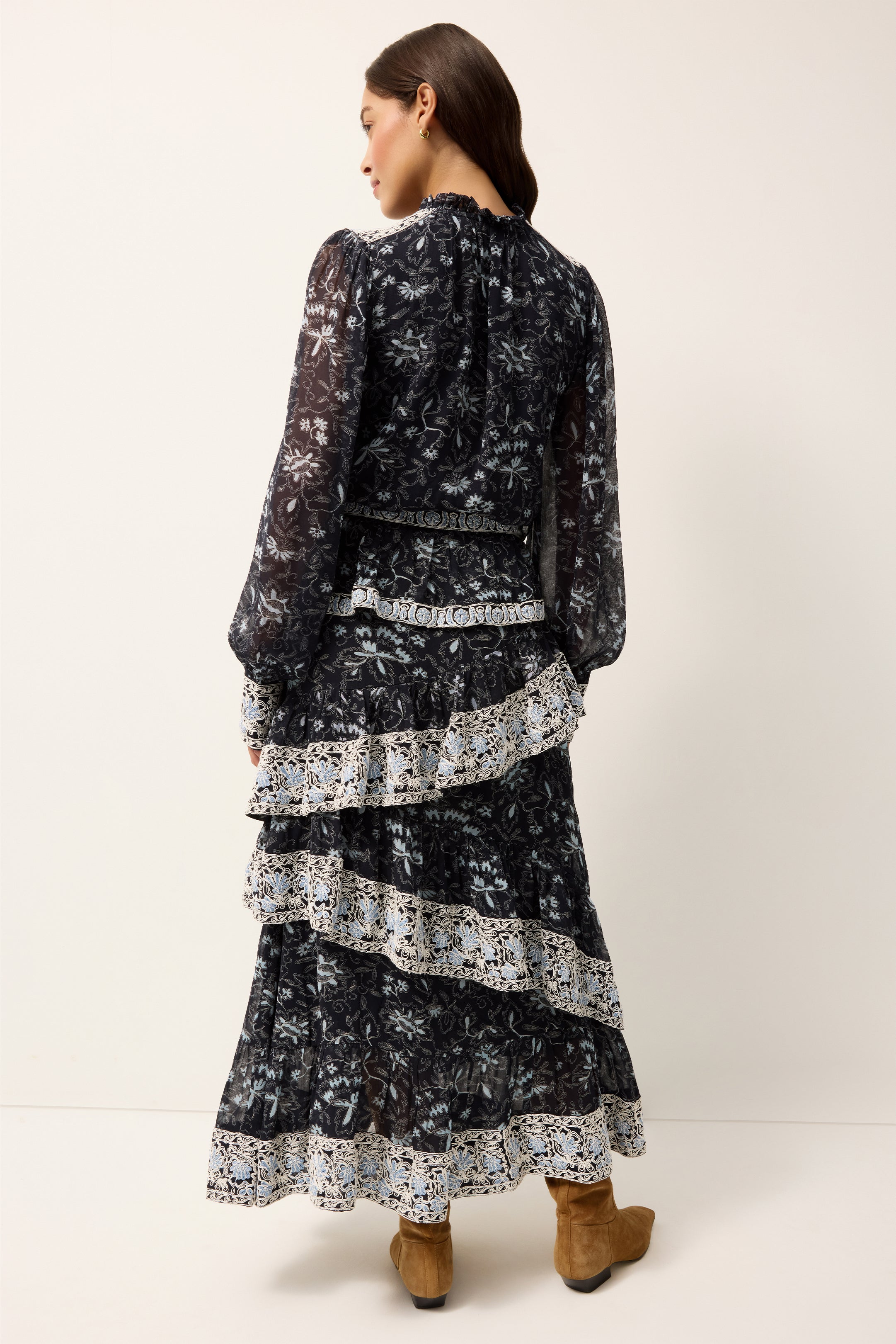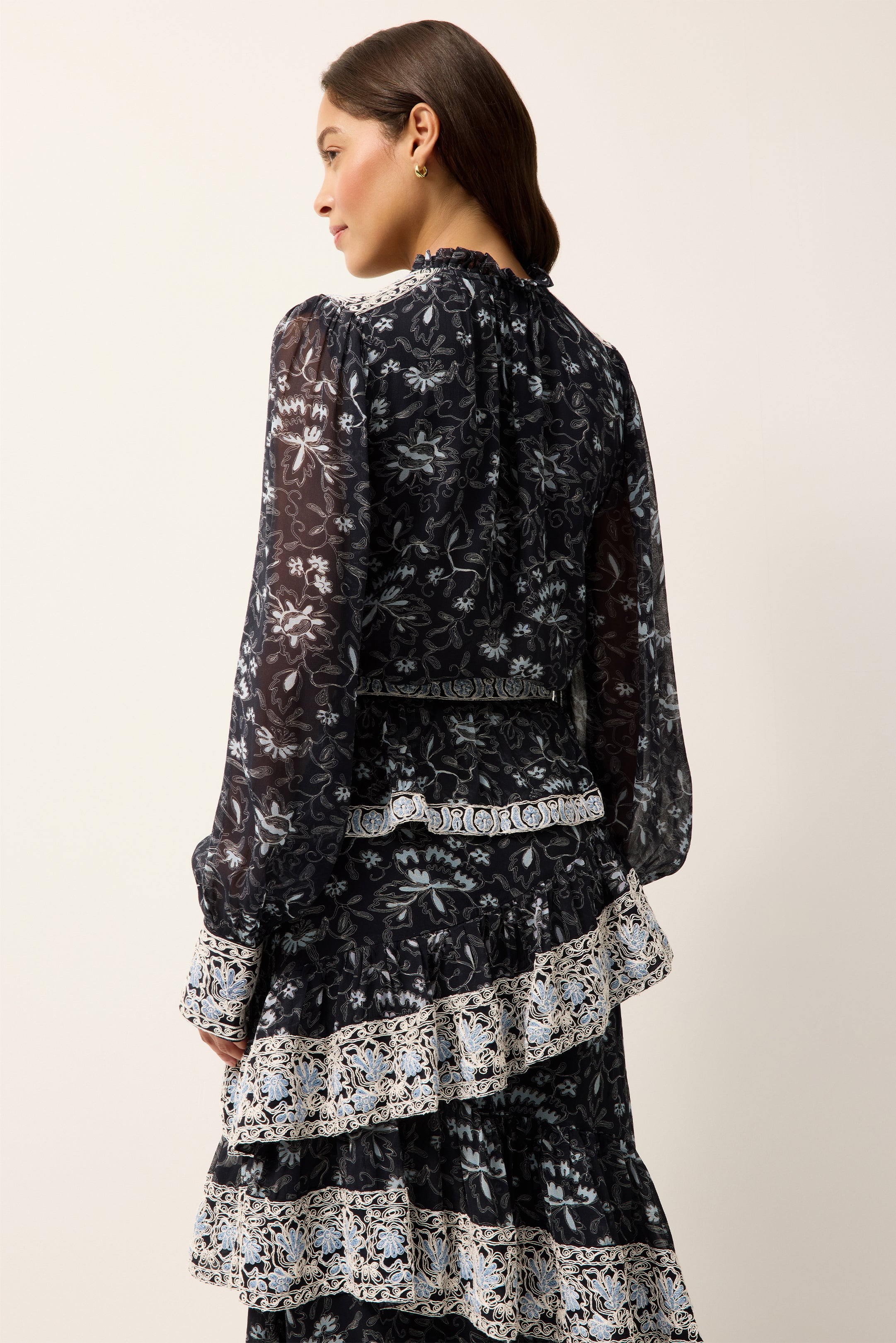 Paired with our matching Paislee maxi skirt in a ditzy blue-and-white floral, the Brielle blouse brings a breath of fresh air to your winter wardrobe. Subtle ruffles at the neck and lace-like edging along the shoulders, placket, and cuffs add soft texture. And if warm-weather travel is on the books, Brielle packs beautifully with tailored white shorts, like our best-selling Mia.