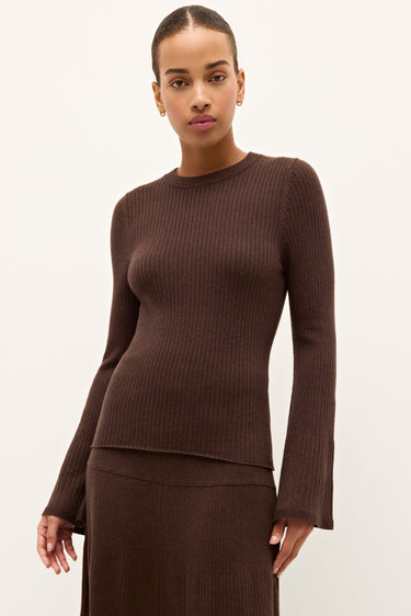 A versatile separate that’s anything but basic, the Carrey top features a body-skimming rib knit and subtly dramatic bell sleeves that bring instant impact to every outfit. Made even more essential in warm Cacao, it pairs effortlessly with a range of bottoms from the collection and beyond. For a cozy tonal statement, style it with the matching Kaylan skirt.