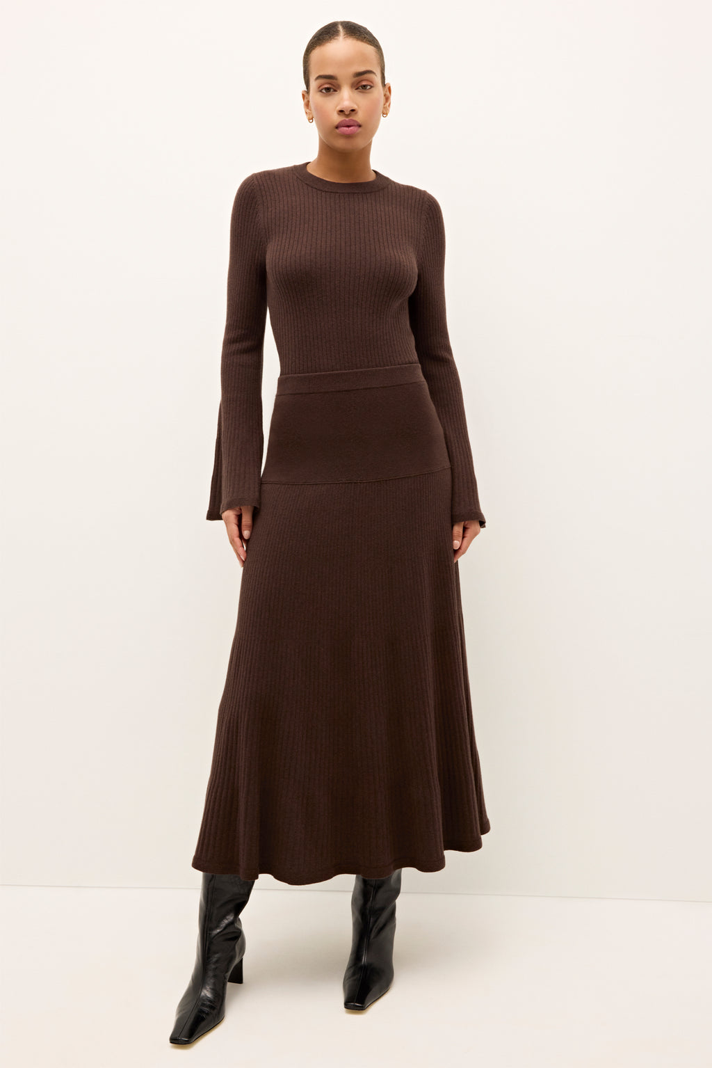 A versatile separate that’s anything but boring, we love the Carrey’s body skimming, rib knit fabric paired with bell sleeves. It’s made even more essential in a rich Cacao hue and plays well with any number of bottoms from our collection or your closet. Paired with our matching Kaylan skirt, it becomes a chic statement from the board room to book launches.