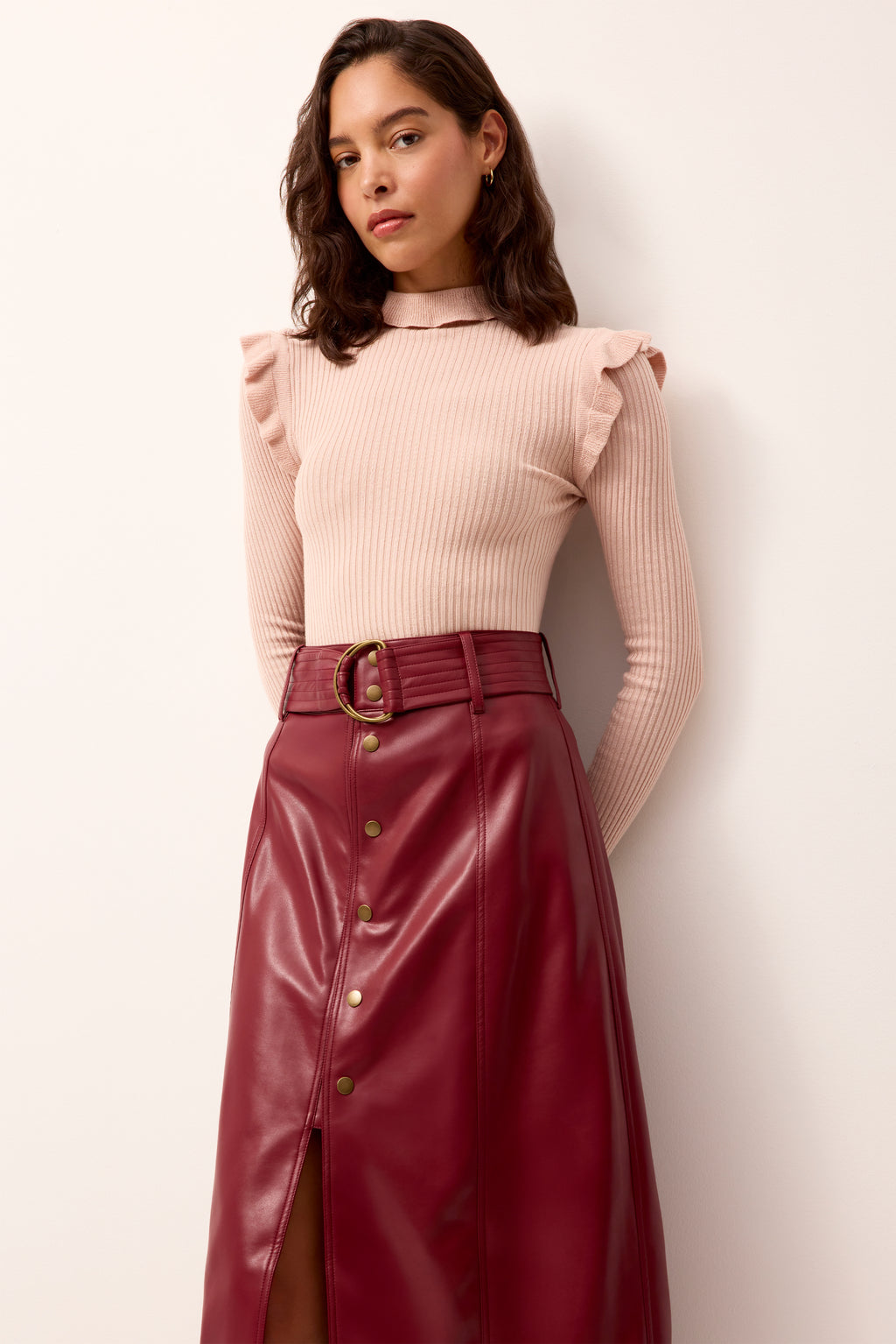 A versatile separate that’s anything but boring, we love the Carrey's body skimming, rib knit fabric paired with bell sleeves. Made even more essential in a seasonal color-soaked rust, it plays well with any number of bottoms from the collection and your closet. Tucked under the Estine wrap skirt in Catalonia, it becomes an artistic statement from the board room to book launch parties.