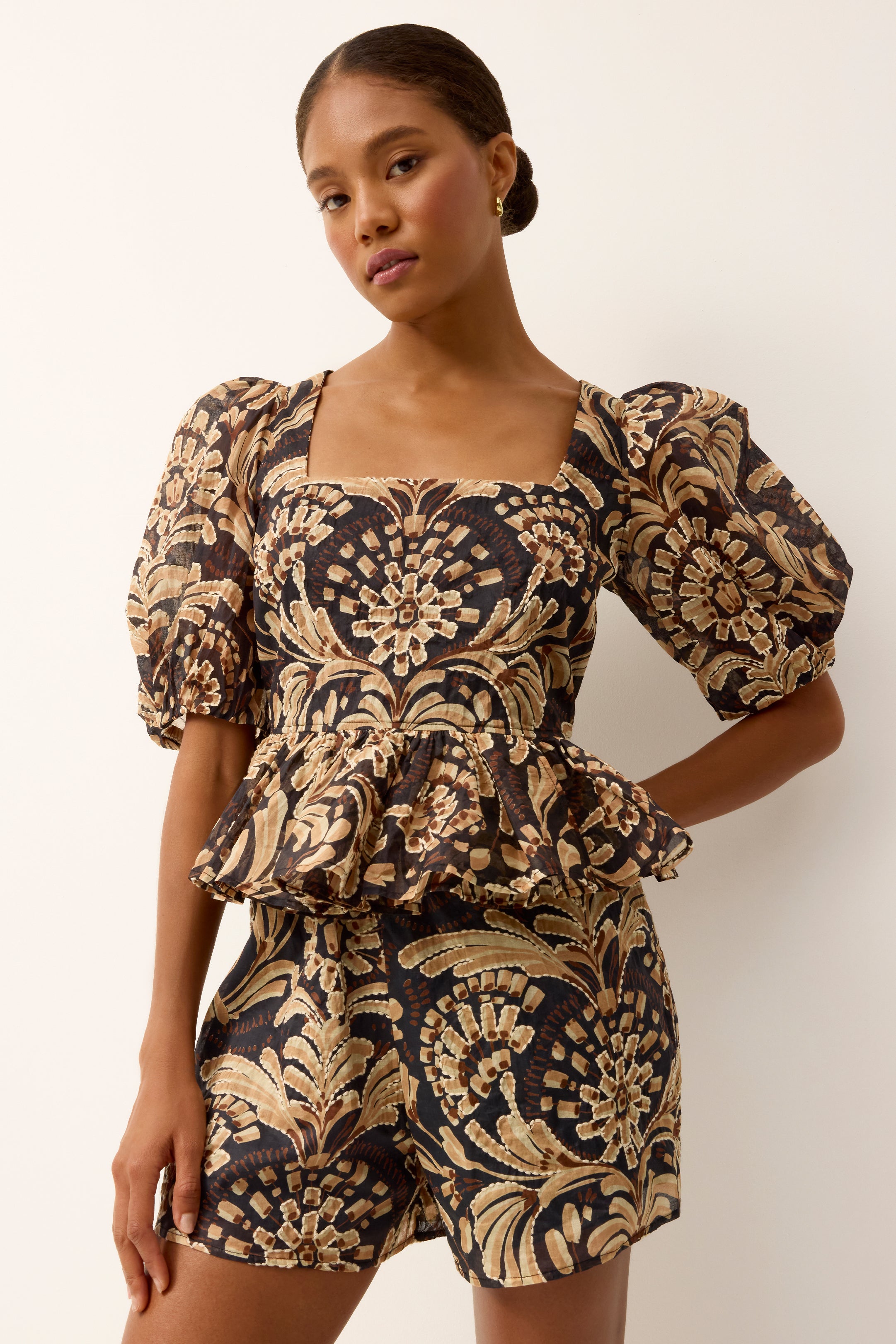 Designed with a high rise, and flattering A-line silhouette, the Cleo short balances ease and refinement. Pictured in Tropez print, it’s finished with all-over floral embroidery in a classic tan-and-black palette. Pair it with the matching Orla top for a coordinated set, or dress her down with a sleek knit.