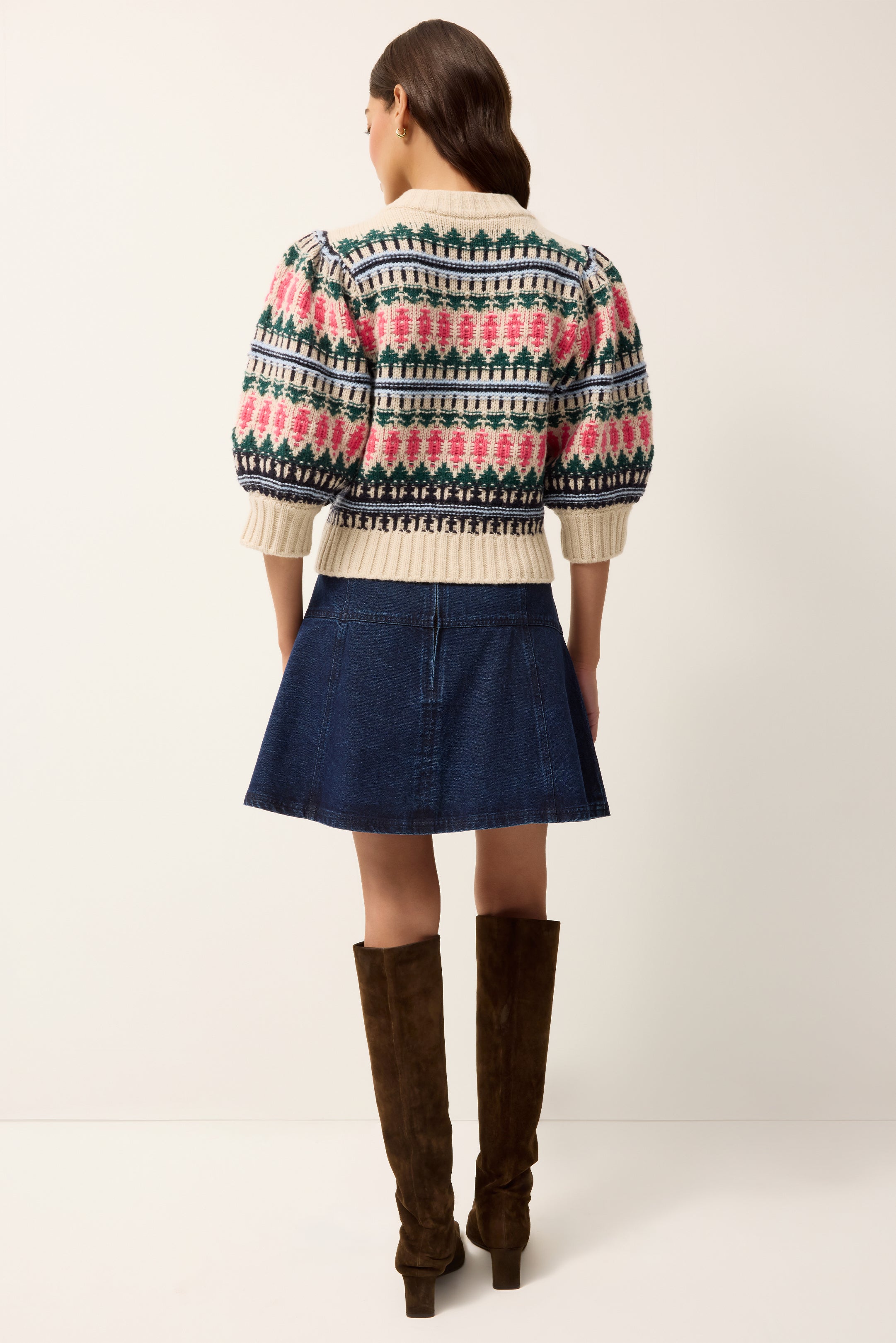 This versatile mini is fitted at the waist and hips with a gentle flare to create a flattering and playful silhouette. Cut from a soft dark wash denim, the Crawford skirt is pictured here with our Gail sweater in Forest.