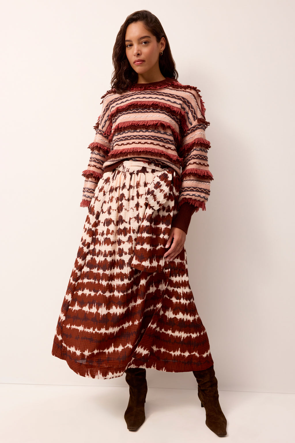 Textured stitching and fringe details add new life to a classic fair isle pattern, steeped in the autumnal palette of our Volcanic colorway. The sleeveless, wool construction of the Desmond popover allows for the best of all worlds, embracing the elements of fall while still allowing for comfort. Ties at the side tailor it to your body, and the organic nature of the Estine wrap in Catalonia creates a stylish juxtaposition that certainly makes an entrance.
