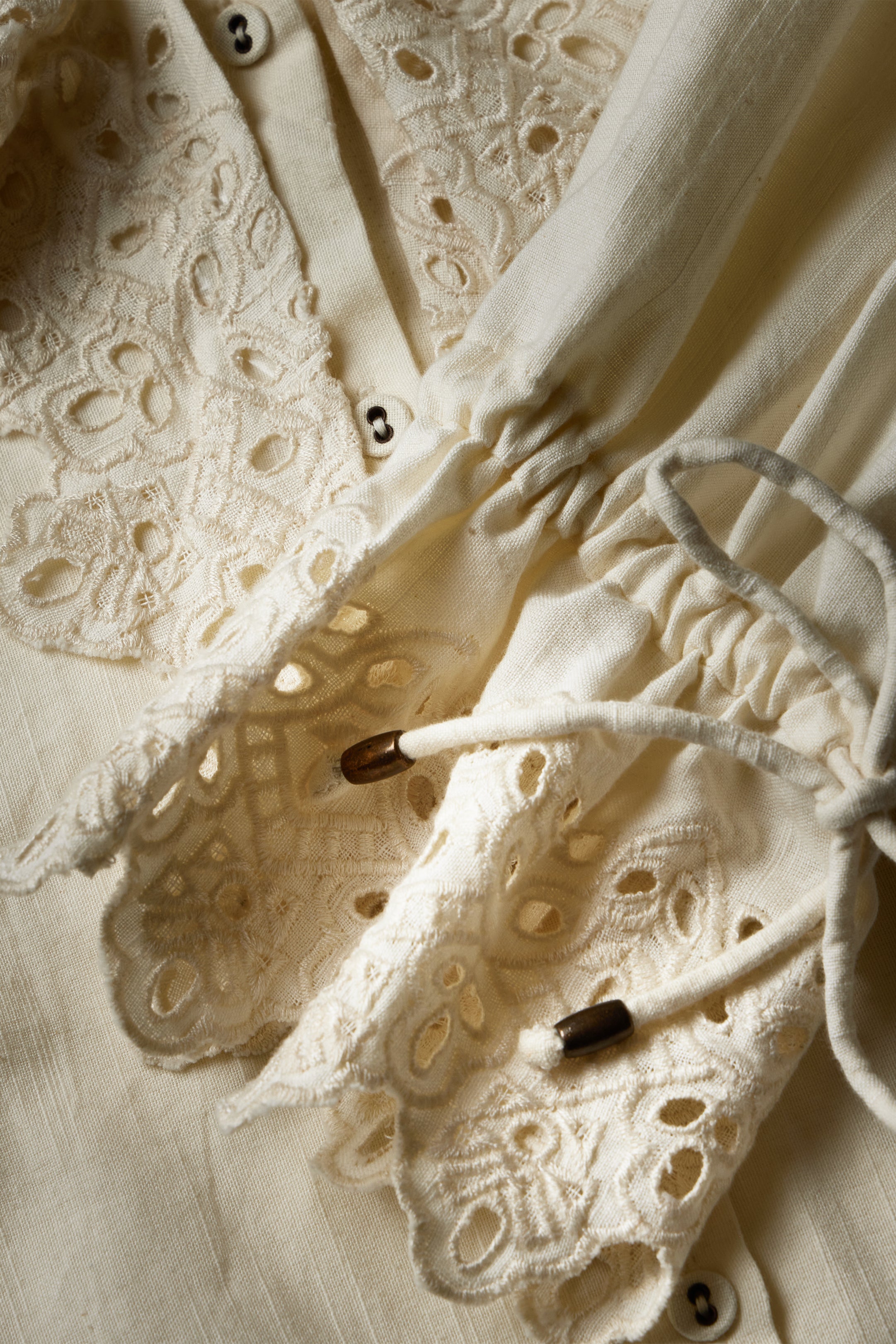 • Embroidery and eyelet detail on ruffle and cuff