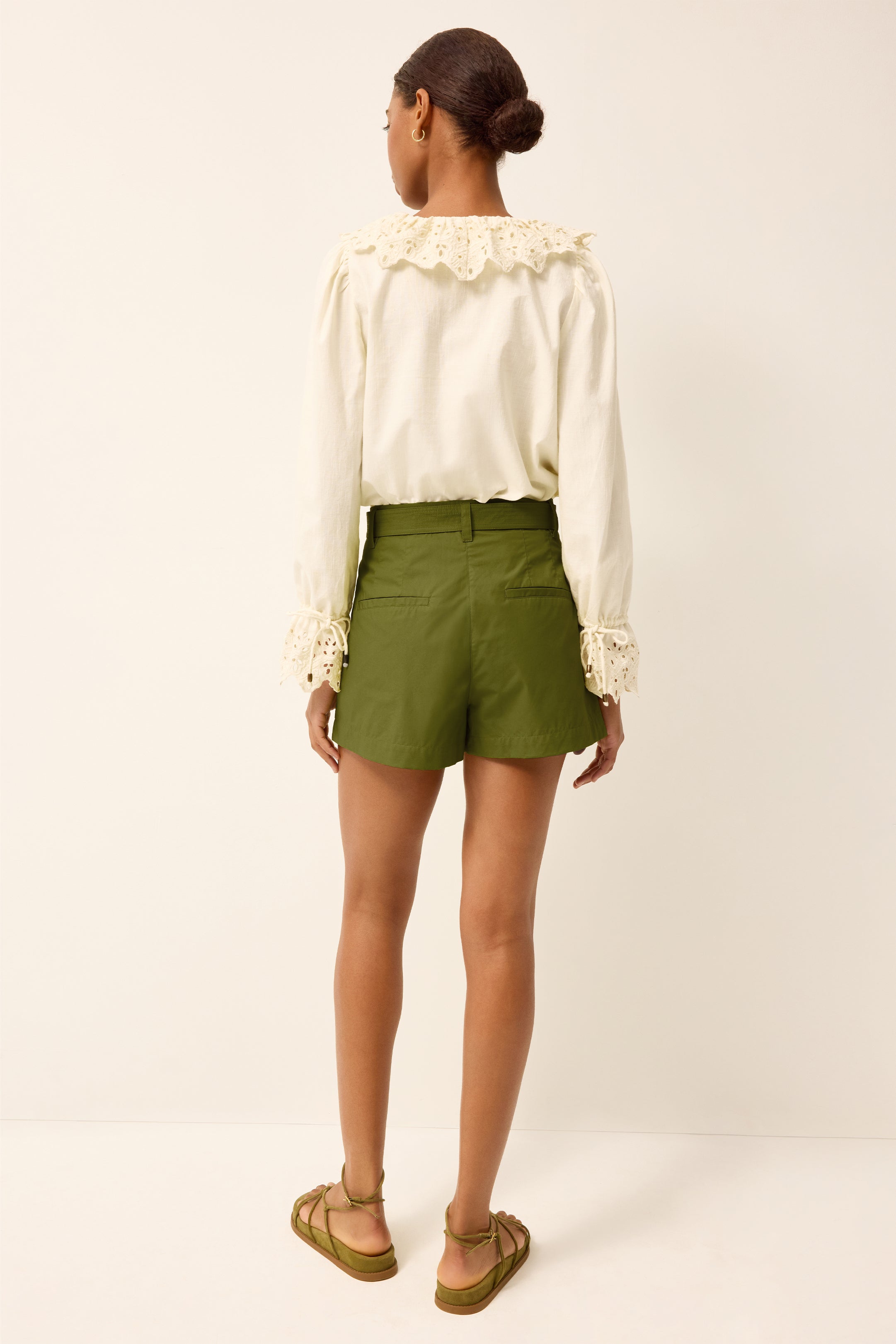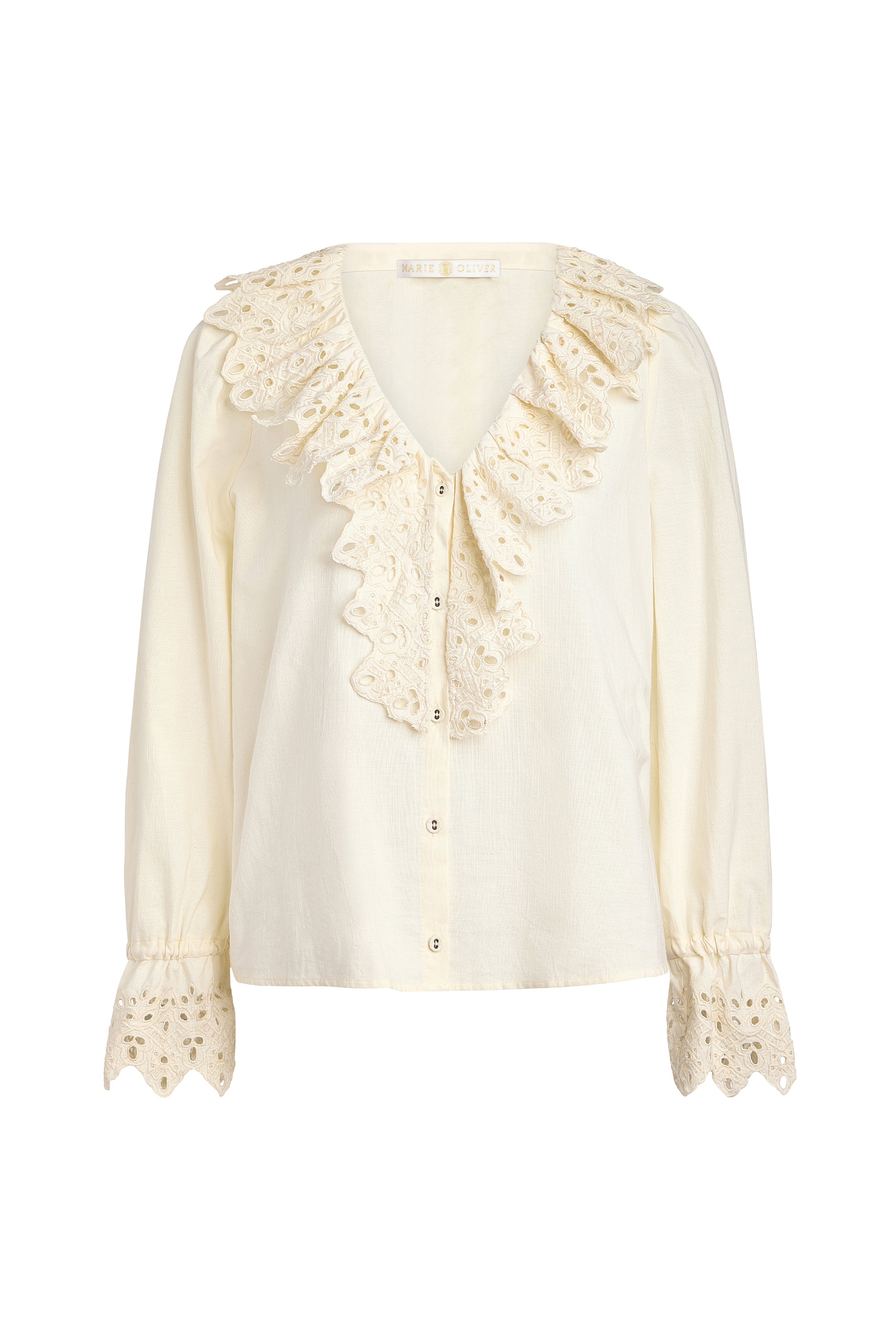 Eden is the spring essential every wardrobe needs. This lightweight ivory poet blouse features a relaxed, slip-on silhouette elevated by delicate embroidery and eyelet detailing on the ruffle and cuffs. Functional drawstring cuffs allow for a customizable fit, making it as practical as it is feminine.