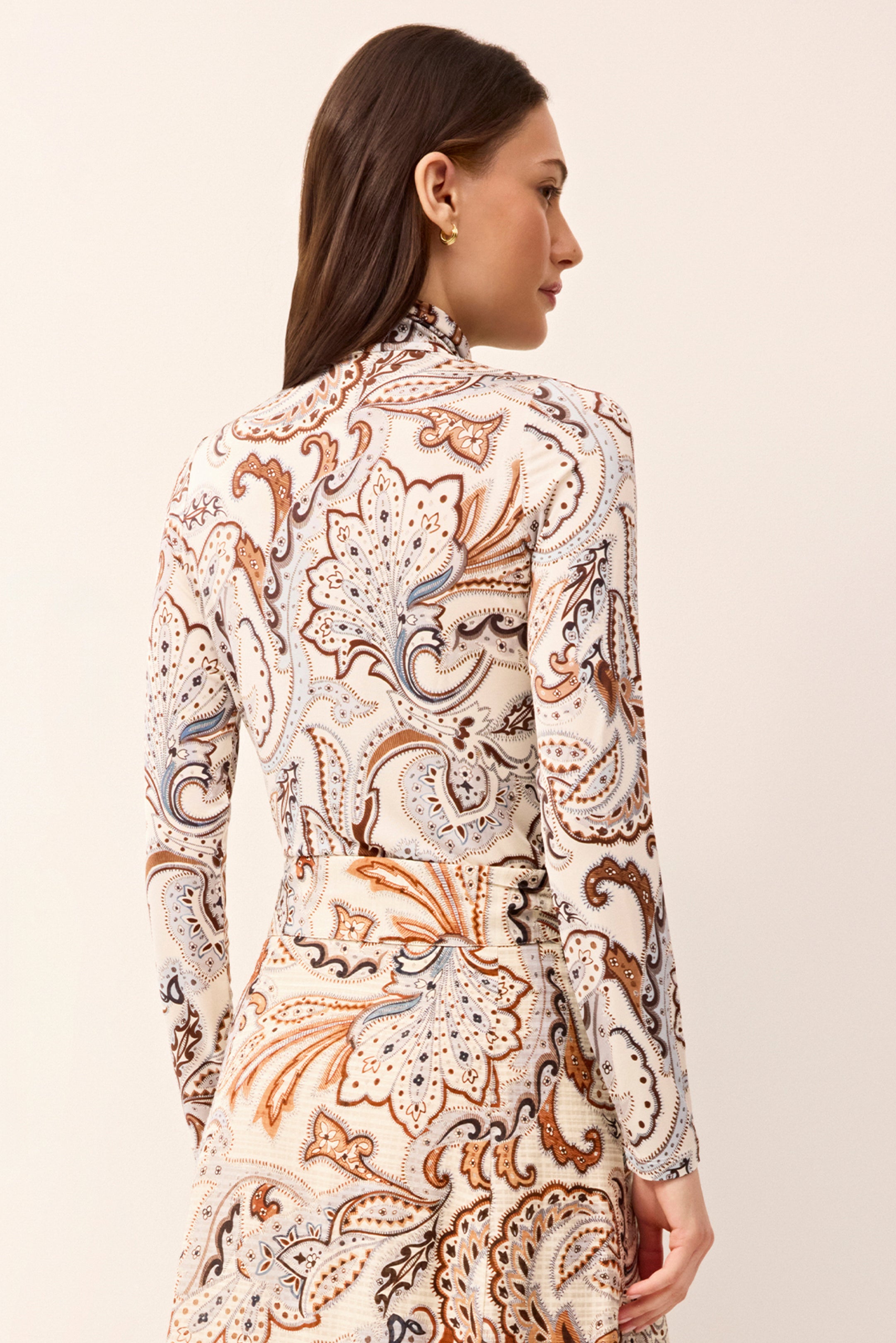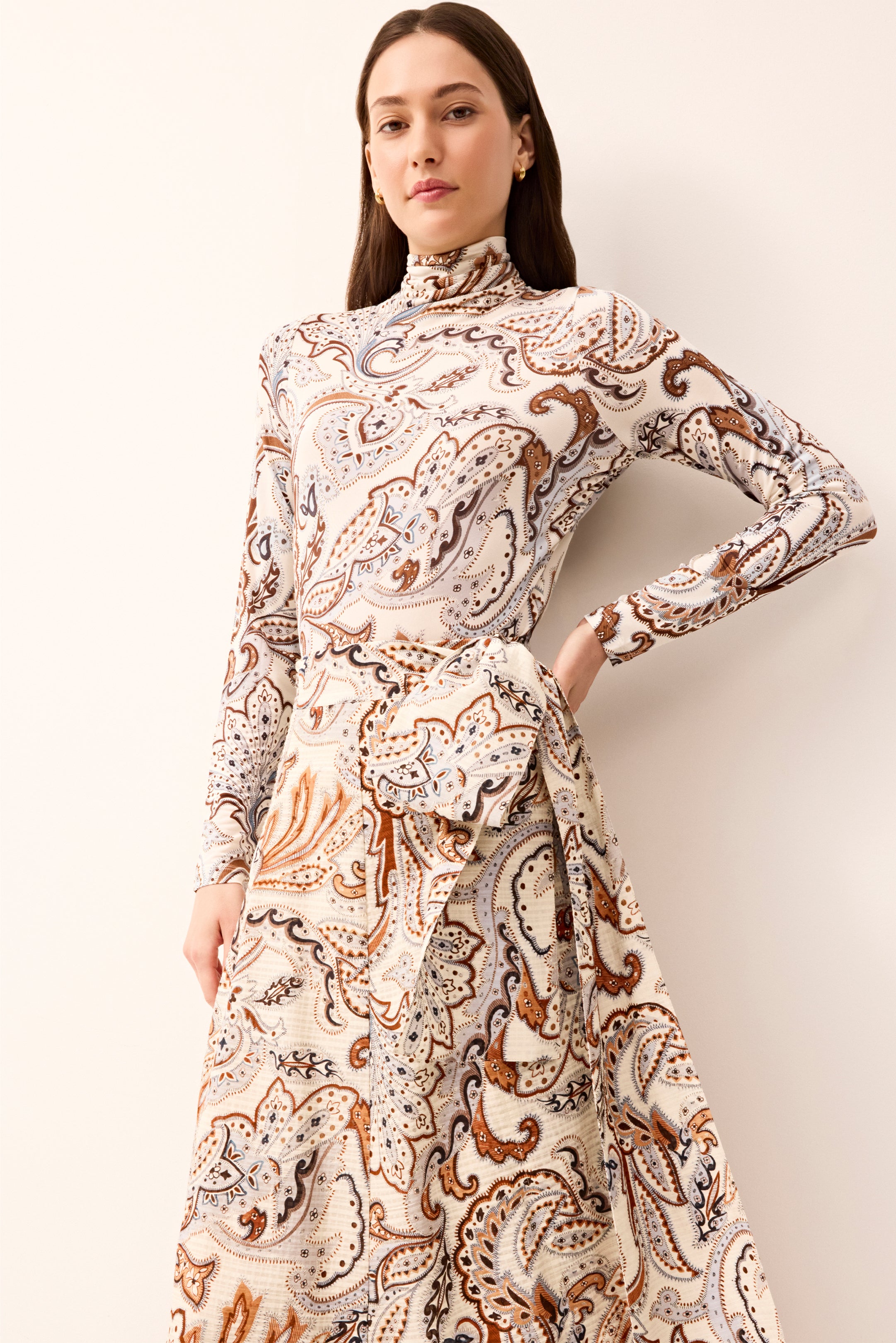 Give your winter wardrobe a refresh with Eloise. The foundational layering top returns in our favorite sumptuous knit fabric while a timeless blue-and-cream paisley print injects confidence and calm into your seasonal wardrobe, a welcome change in the post-holiday come down. Eloise is pictured here with our matching Estine wrap skirt for a sophisticated seasonal set.