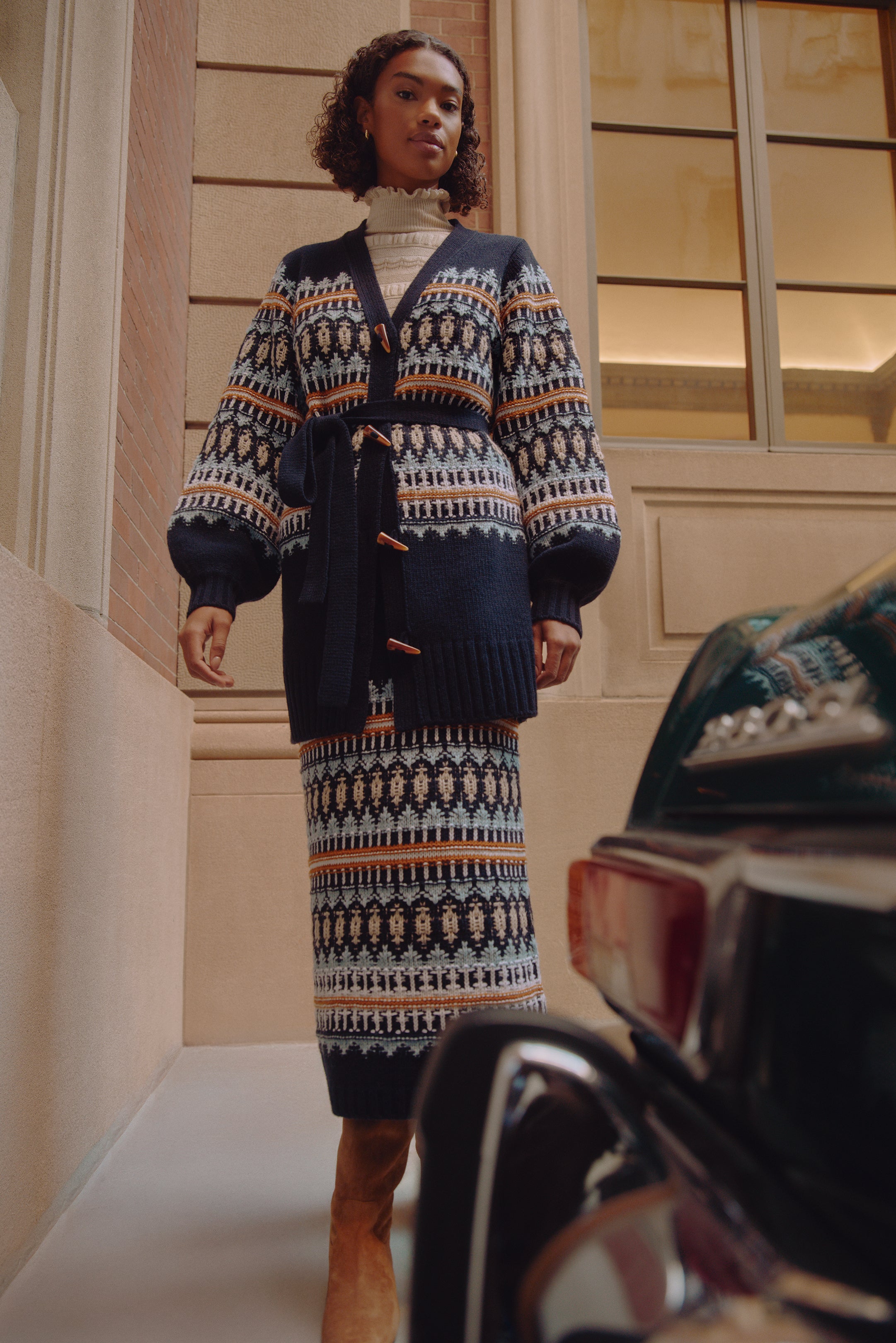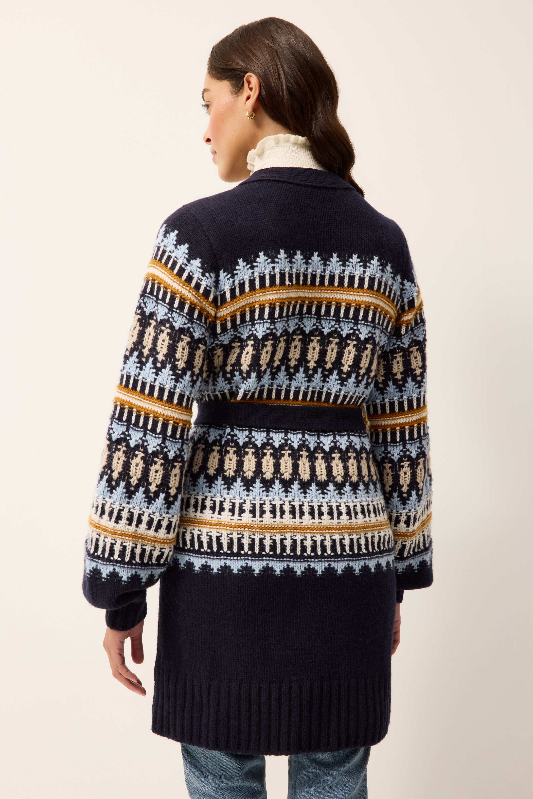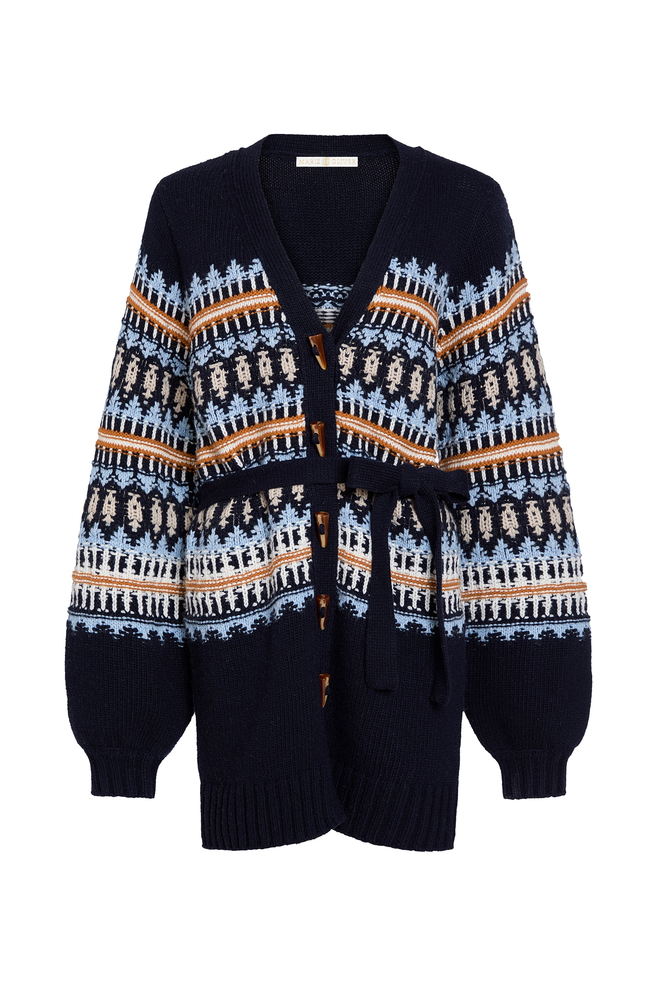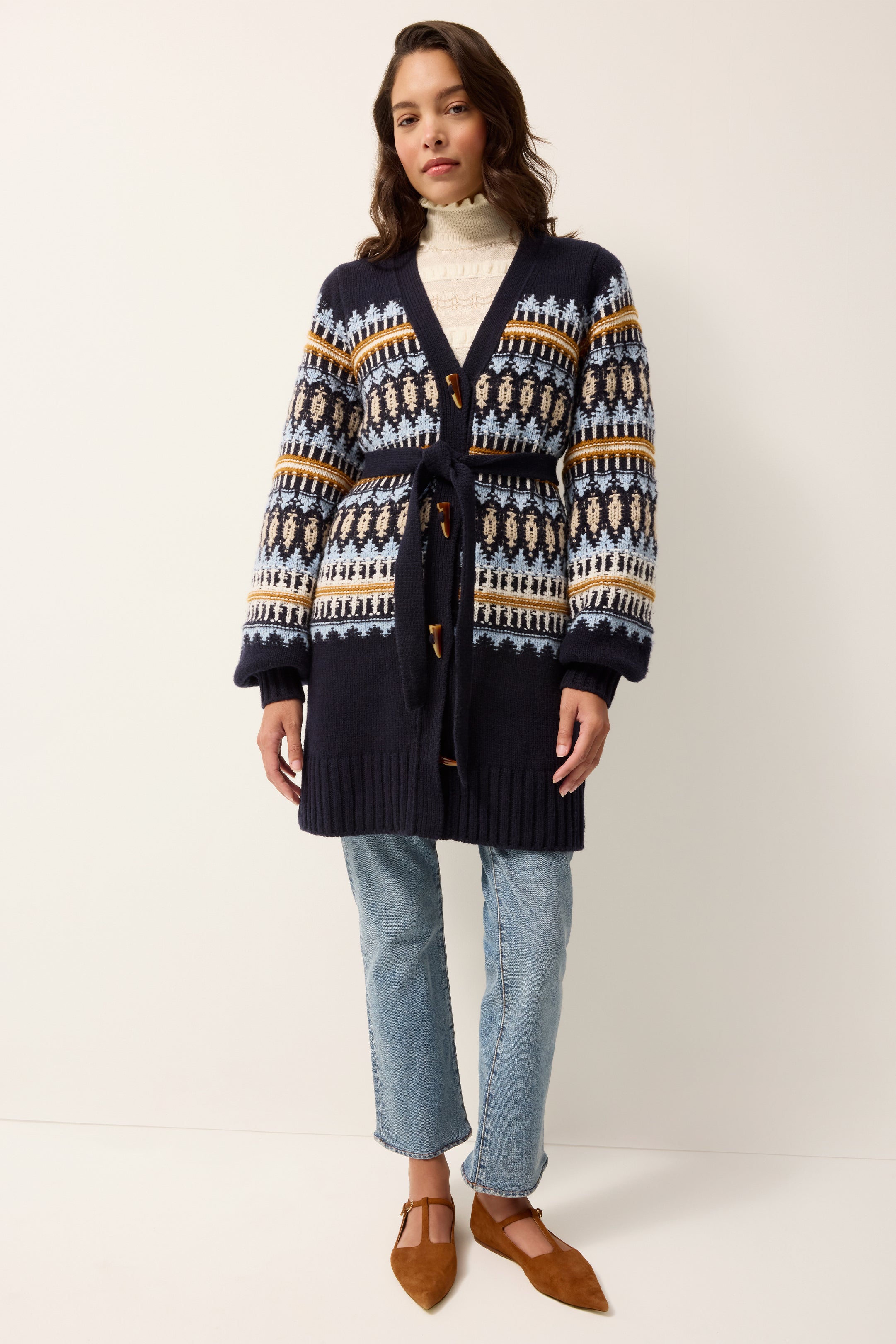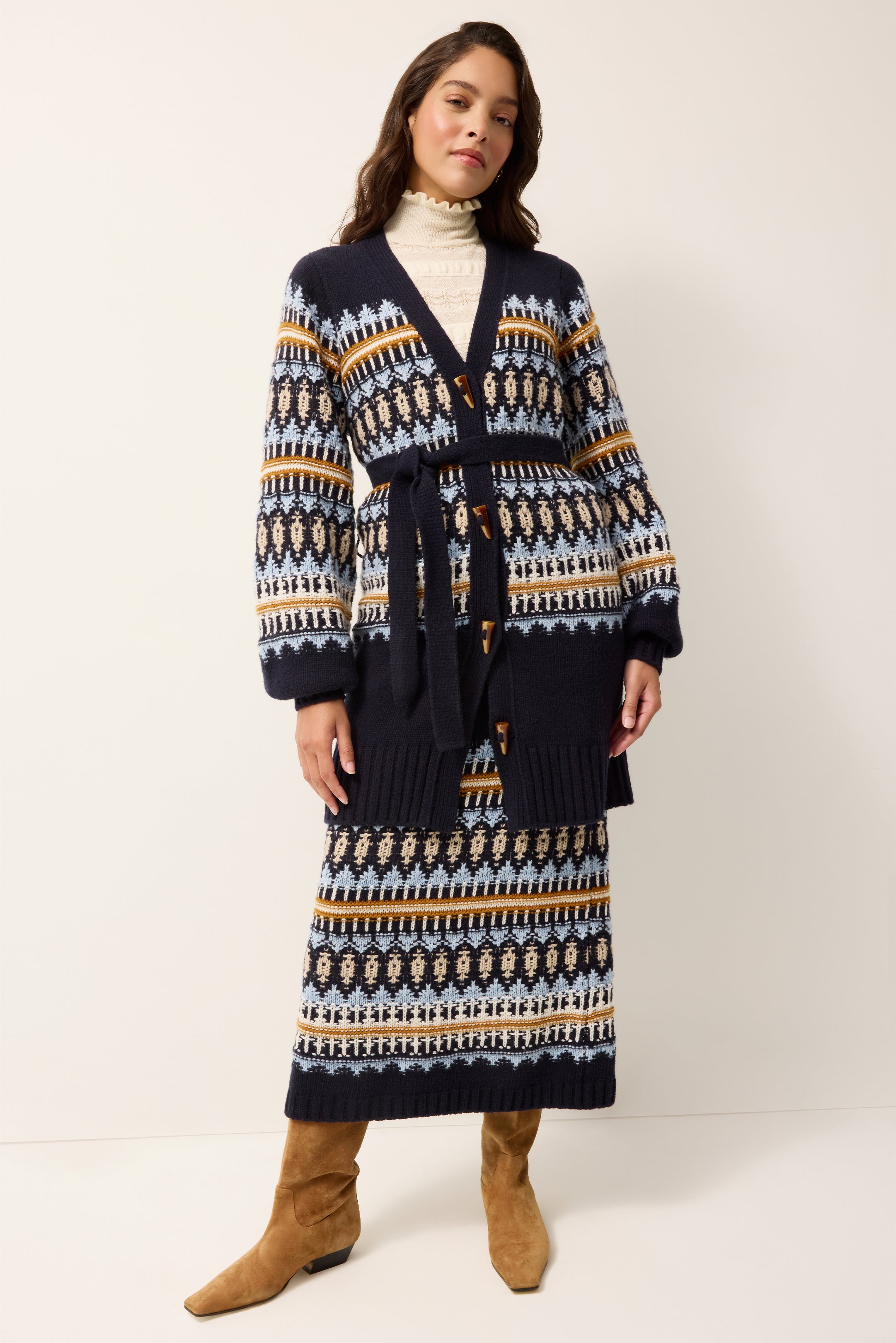 Our Ferne Cardigan reimagines classic Fair Isle through a modern lens. The deep navy palette, patterned yoke, and belted waist bring structure to a traditionally cozy knit, creating a polished layer with personality. Designed to be worn open or cinched, Ferne pairs beautifully with the matching Gianna skirt and Adison top in Ivory for a look that feels equally at home in the city or at a chic ski resort.