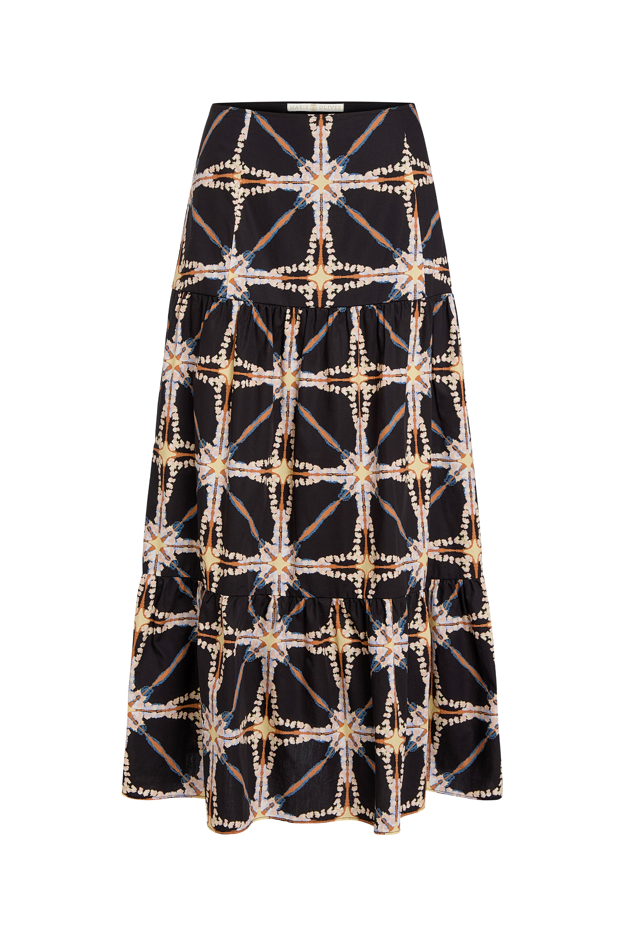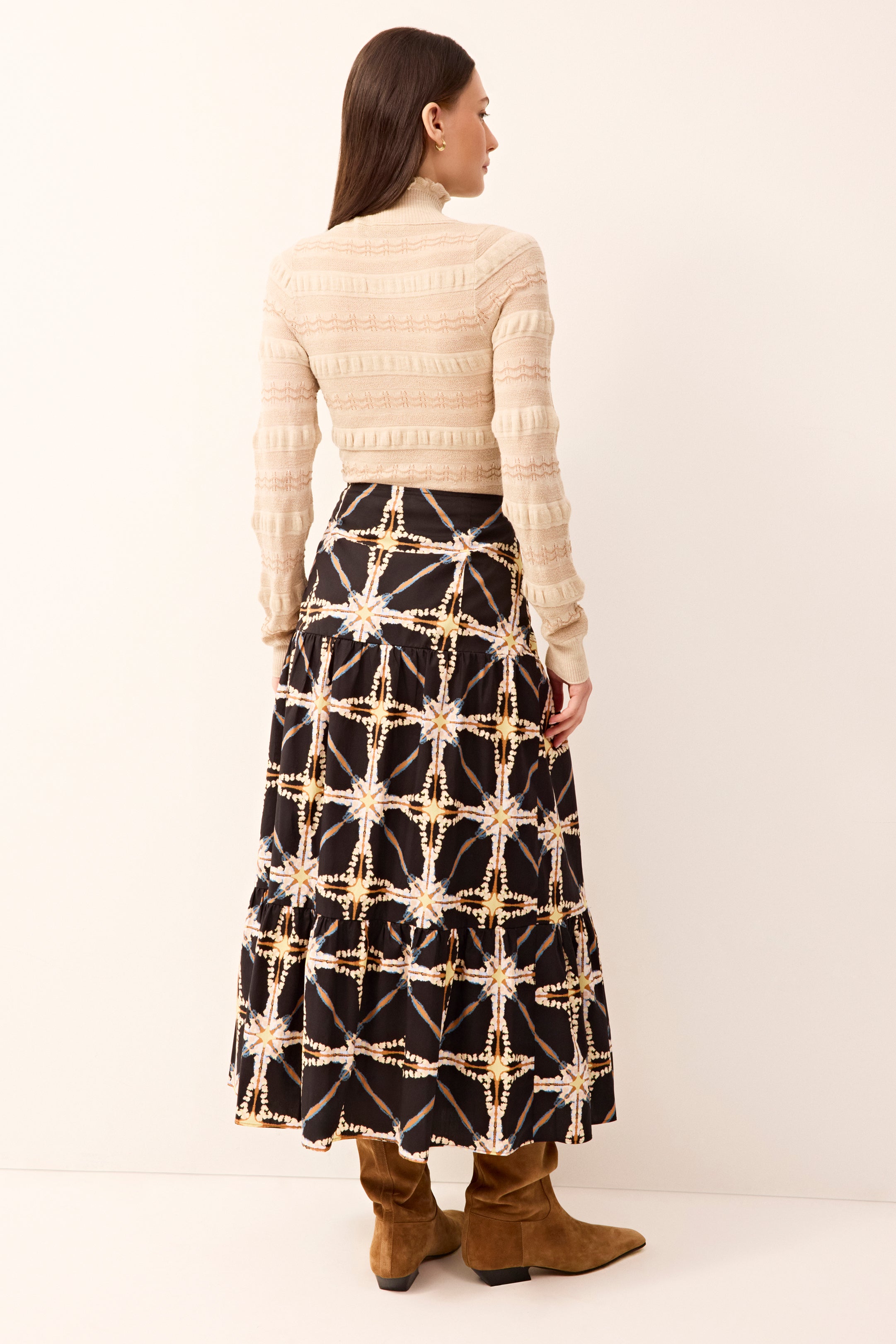 A tiered printed maxi skirt like our new Hines silhouette is a Marie Oliver staple, no matter the season. Shown here in Polaris—a fashion-forward take on tie-dye in a neutral winter palette—Hines brings ease and elegance to year-round dressing. Pair it with our Cecile sweater in Bronze for an elevated everyday look, or dress it up with the figure-skimming Eloise top in a matching print.