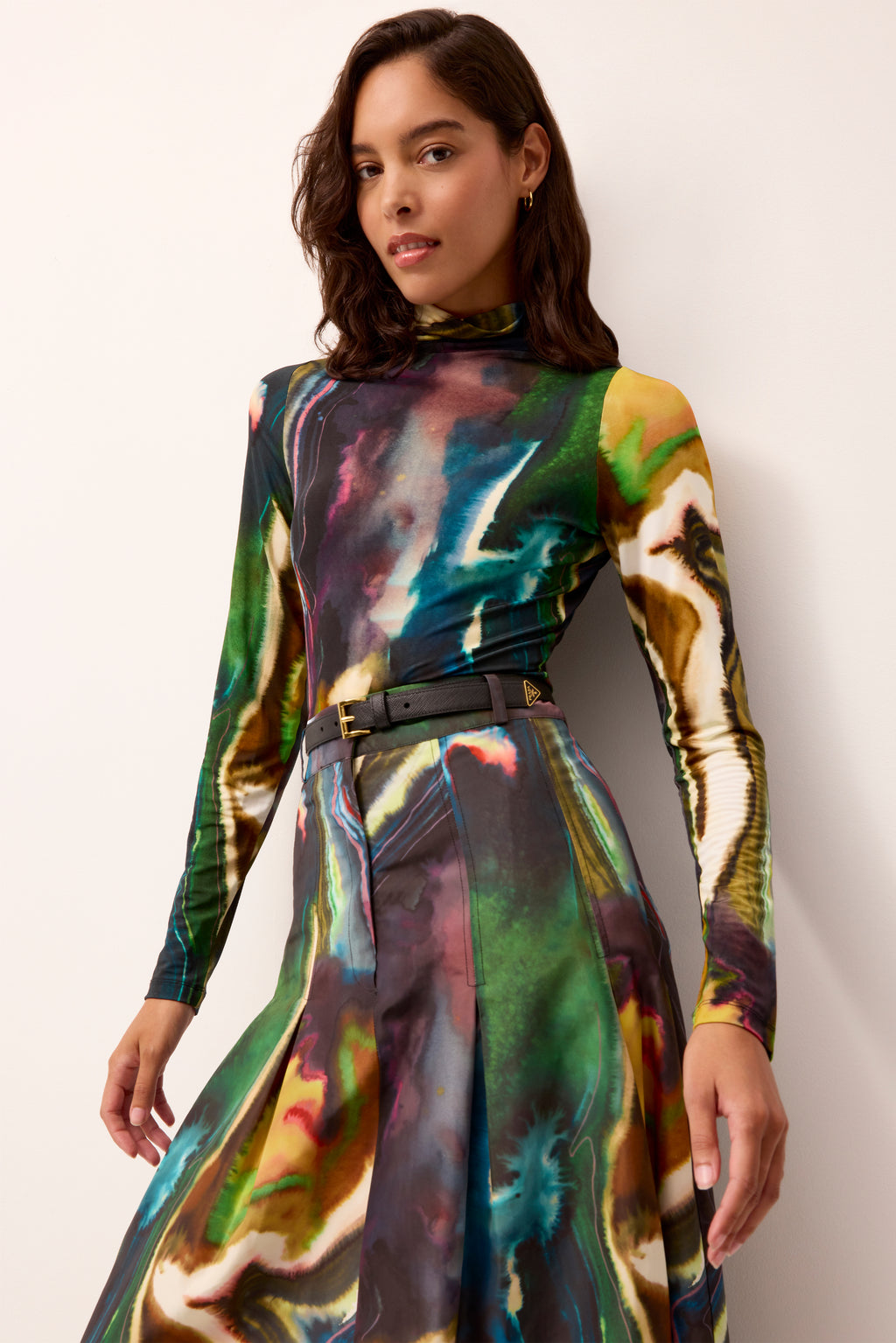 A slightly cropped A-line shape combined with the colorful, geological-inspired Delta print makes the Jamie top one of our design team’s favorite tops for fall. For an edgier editorial look, pair the singular silhouette with our matching Faith skirt.