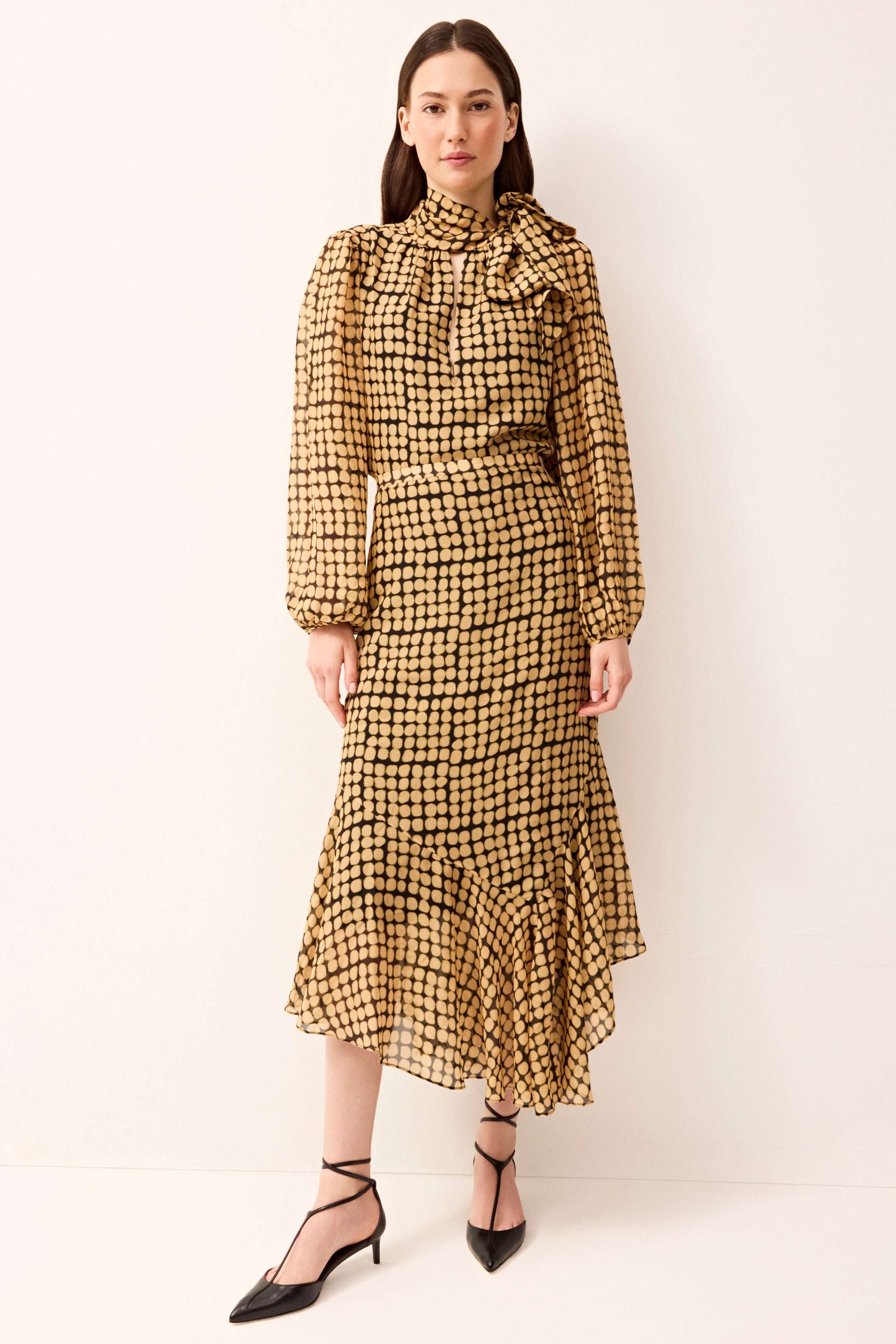 This printed midi skirt with feminine design details like the asymmetrical ruffle at the hem is classic Marie Oliver complete with a scene-stealing pattern. Because while Krista is striking on her own, the silhouette wins a permanent place in our holiday party wardrobe rotation courtesy of our Dapple print, a glimmering, black-and-gold dot motif that recalls the twinkle of Christmas lights through a darkened living room window. Style with the matching Vivianne top for a matching set that stuns.