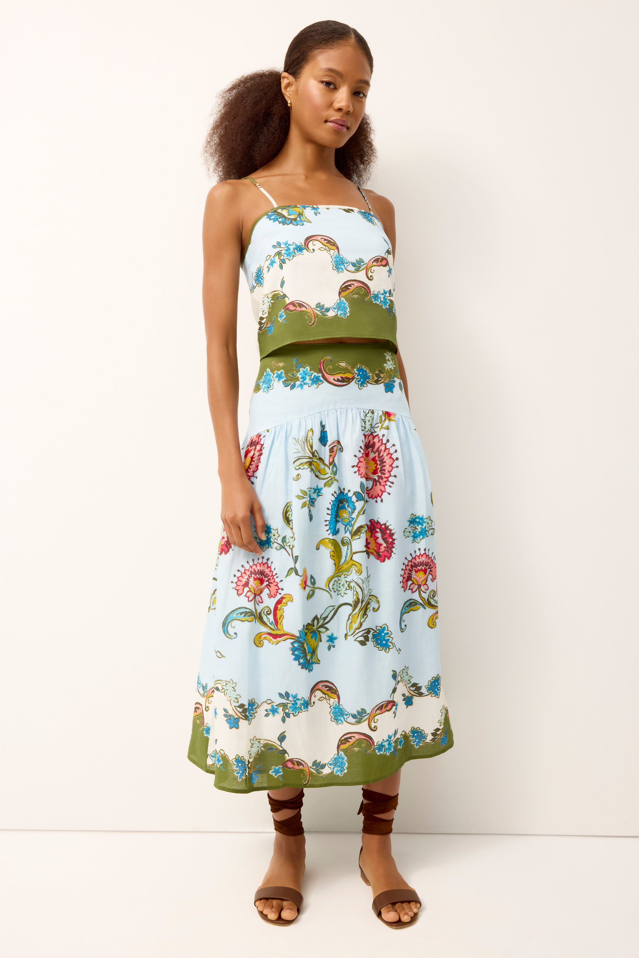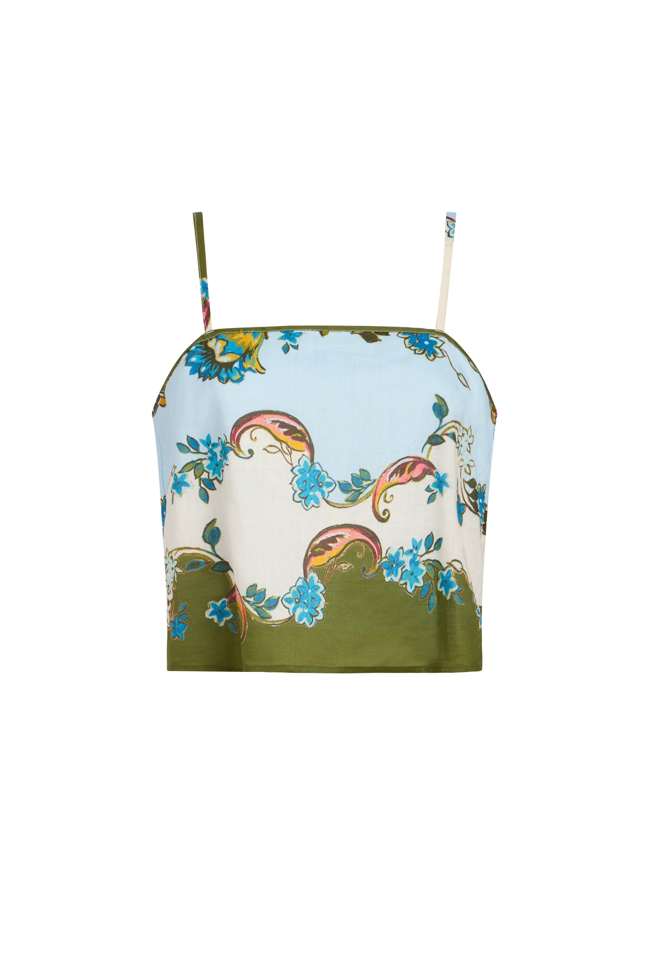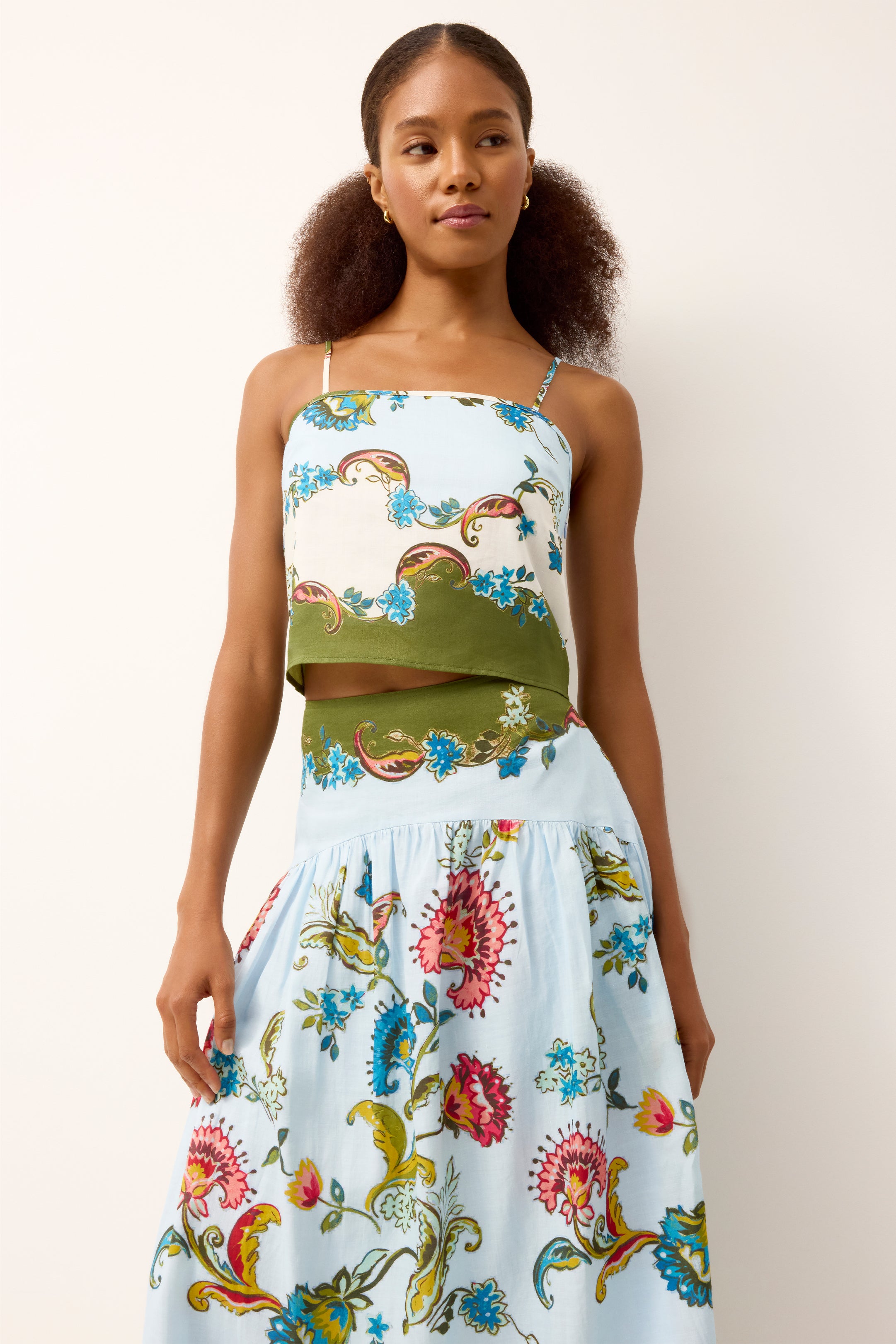 Kyra is a cropped top designed to stand on its own or as part of a set. Adjustable shoulder ties offer functionality, while the clean neckline and tailored fit keep the look polished. Fully lined for a smooth silhouette, Kyra is effortless to wear and easy to style. Pair it with the matching Vicki Skirt for a print-on-print moment, or team it with tailored shorts for a refined warm-weather outfit.