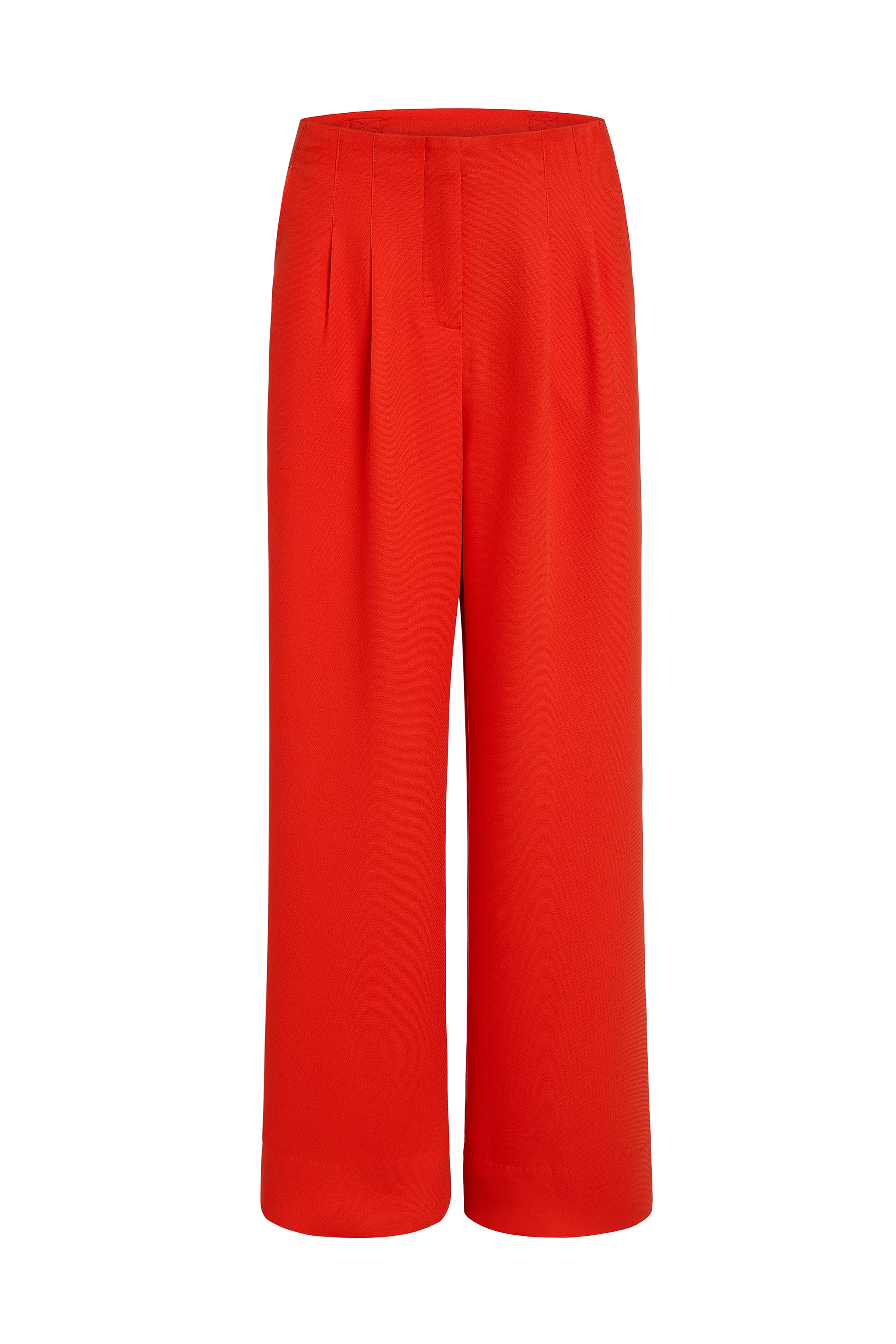 At Marie Oliver, we balance bold prints and playful details with timeless staples like our new Macbee pants. These wide-leg trousers feature a double-pleated front and a back buckle detail for an adjustable fit. Shown here in a bold Grenadine hue, our winter-weight Macbee pant is styled with our matching Oryan blouse for a confident take on monochrome dressing. Stand out at your next holiday gathering in this unexpected colorway.