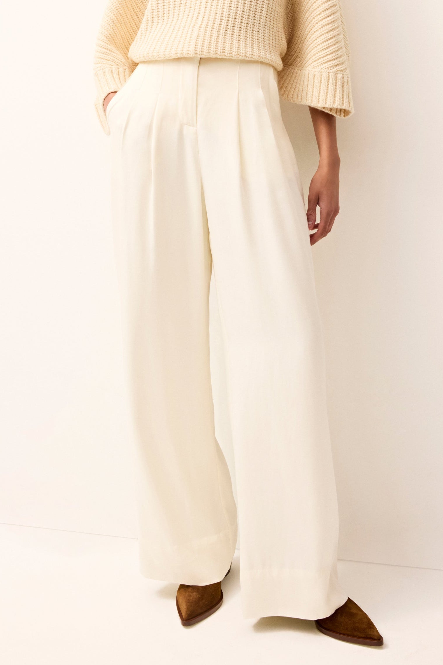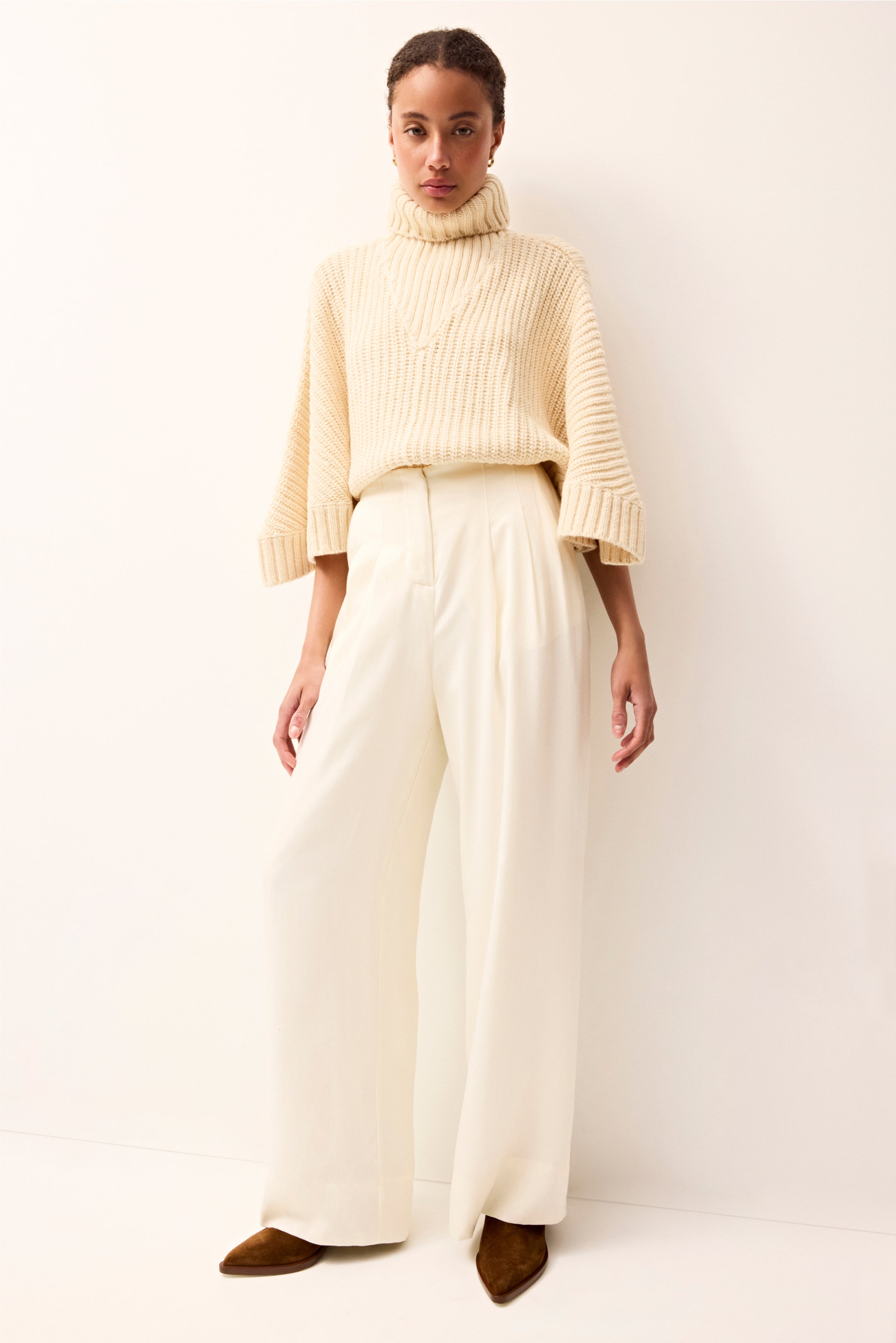 At Marie Oliver, we balance bold prints and playful details with timeless staples like our new Macbee pants. These wide-leg trousers feature a double-pleated front and a back buckle detail for an adjustable fit. Shown here in Sugar, our winter-weight Macbee pants are styled with our Annika popover in Sugar for a chic monochrome look in classic winter white.