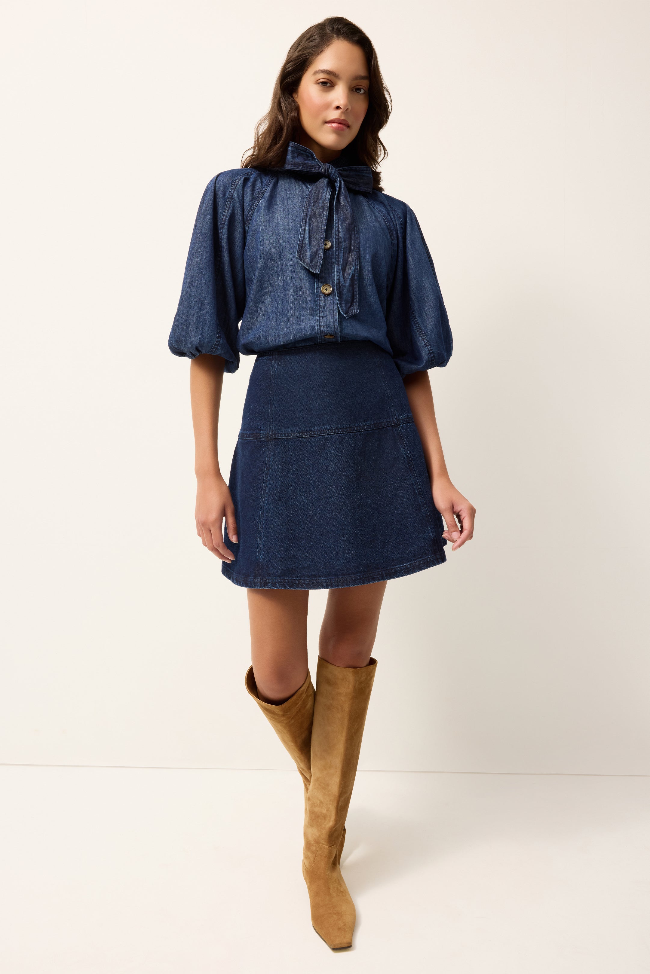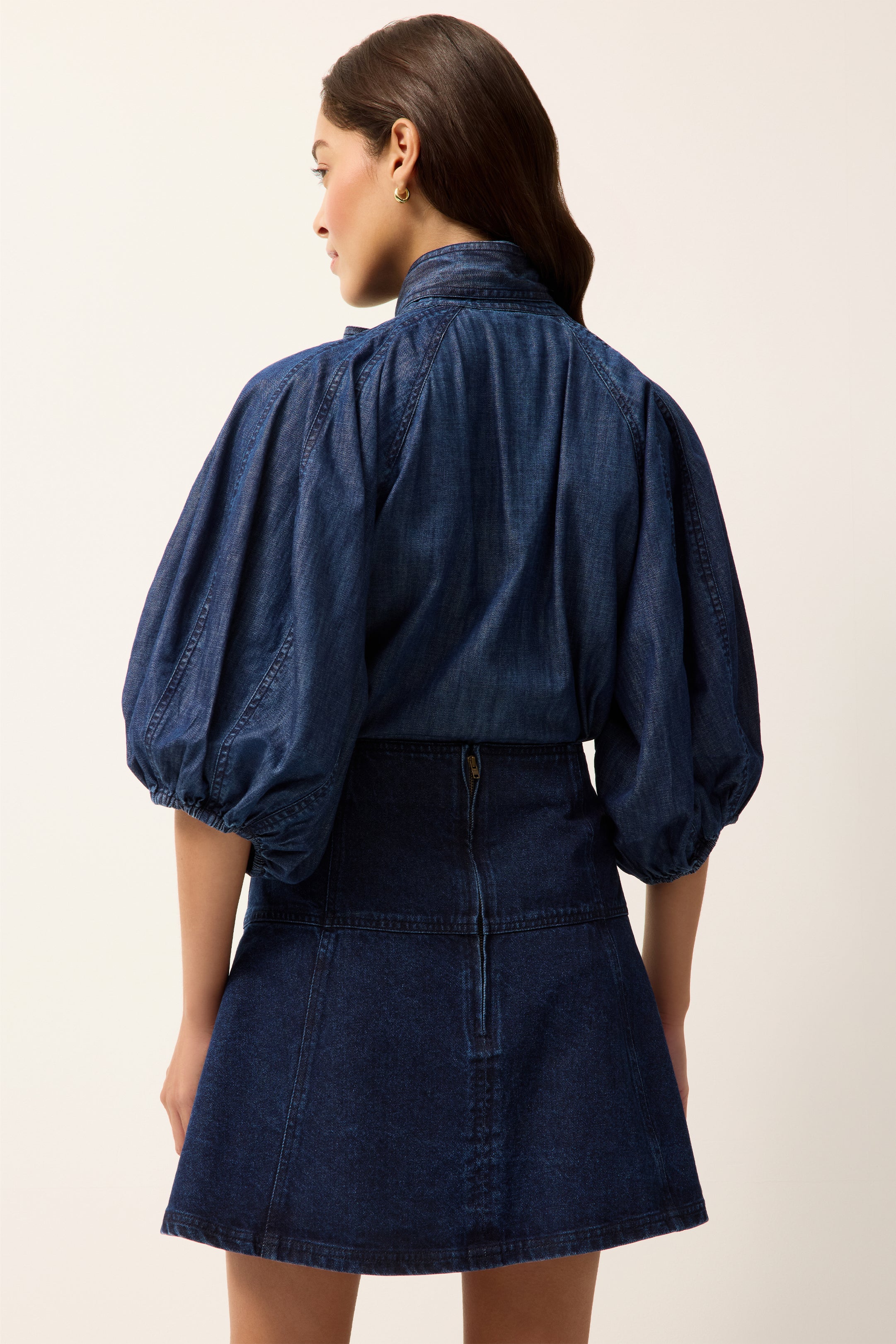 Featuring dramatically puffed sleeves, an optional tie at the neck, delicate stitch detailing, and a pretty button-front placket, our Navi top in midnight blue chambray brings an elegant touch of punk-rock femininity to the tailored Crawford mini skirt, pictured here in tonal navy denim. It’s a refined, modern take on denim-on-denim dressing.