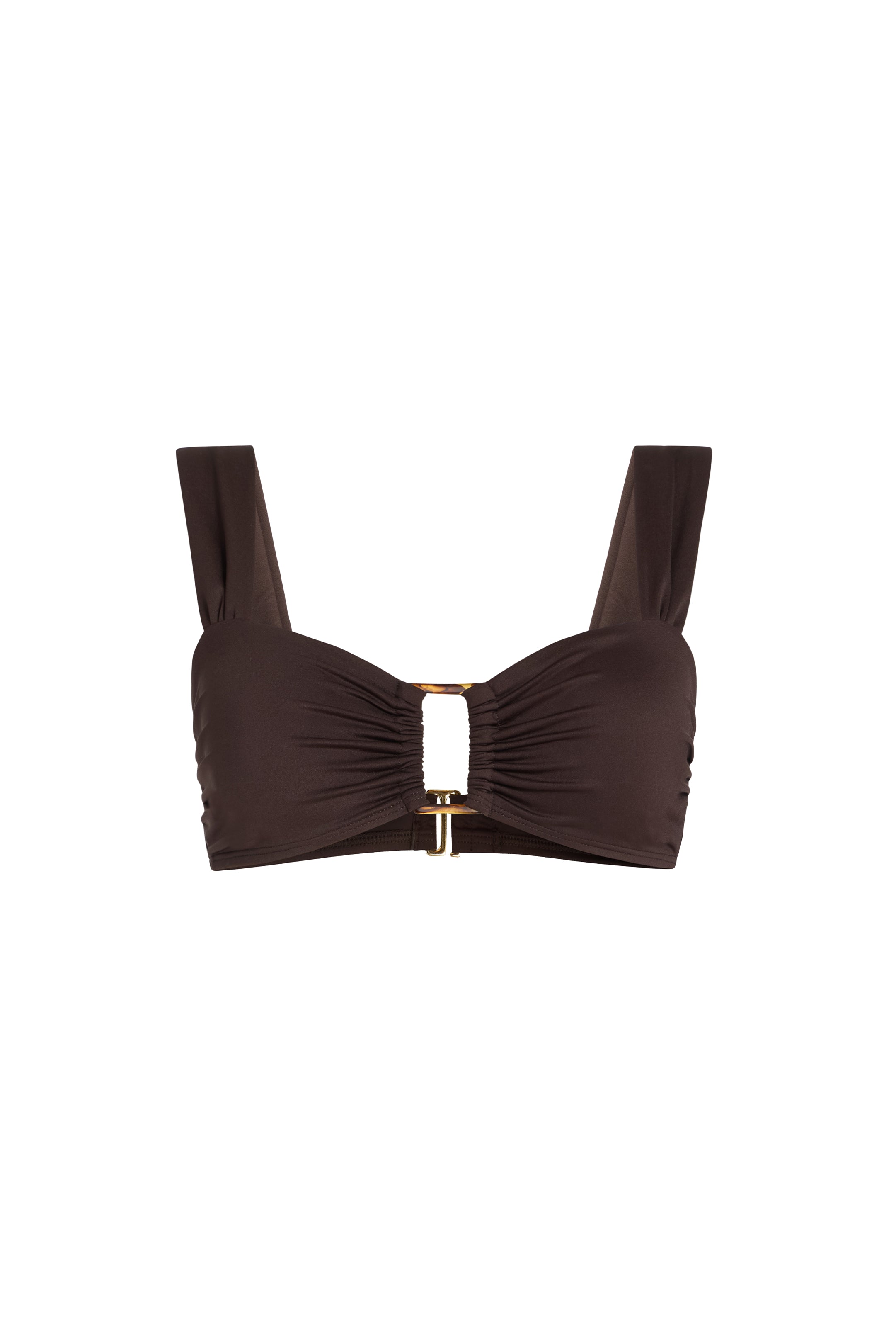 Playful and polished, the new Neela bikini top brings personality and practicality to seaside style. Designed in timeless Walnut brown, the silhouette features a softly structured bust with a tortoiseshell ring detail at the center. Wide straps provide comfortable support, while lightly compressive fabric offers a flattering fit that stays in place for long days in the sun. Pair it with the matching Elle bottom for a complete water-ready set.