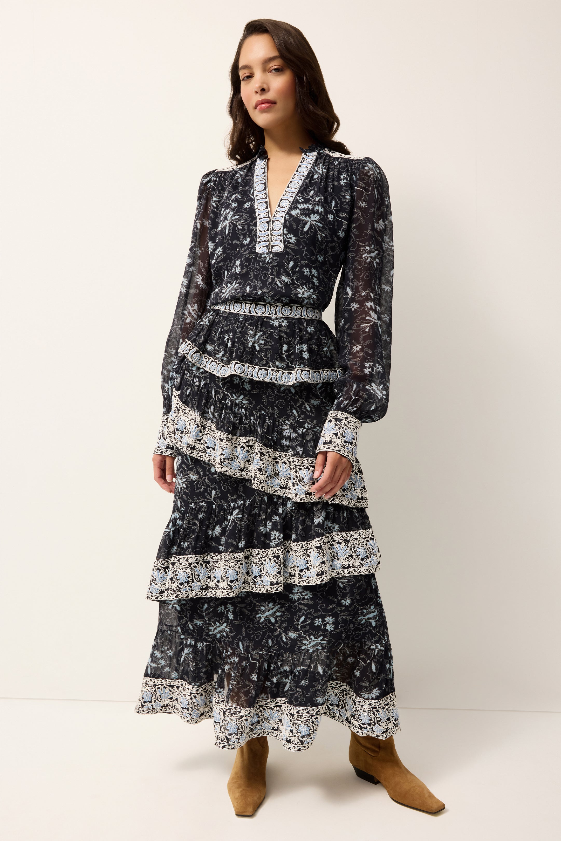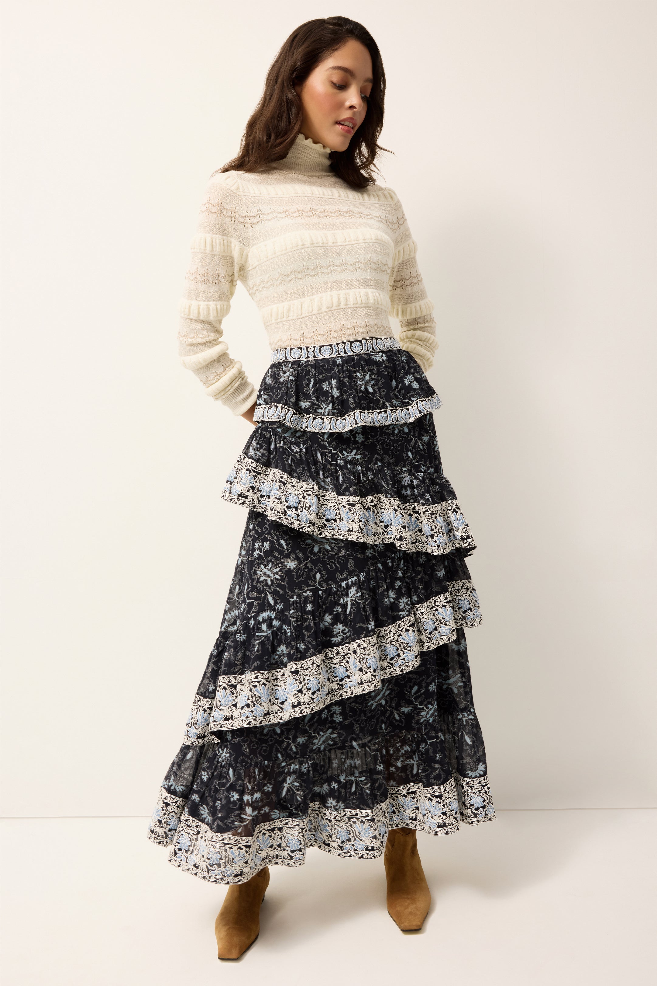 The maxi skirt is a year-round staple that bridges and blurs seasonal gaps, making it a Marie Oliver favorite no matter what the calendar reads. Designed with asymmetrical tiers and lace-like detailing, our new Paislee skirt is rendered in a cool blue-and-white ditzy floral. Style it with a cozy sweater like our Adison turtleneck in Ivory, or pair it with a simple tank if you’re headed for warmer climates.