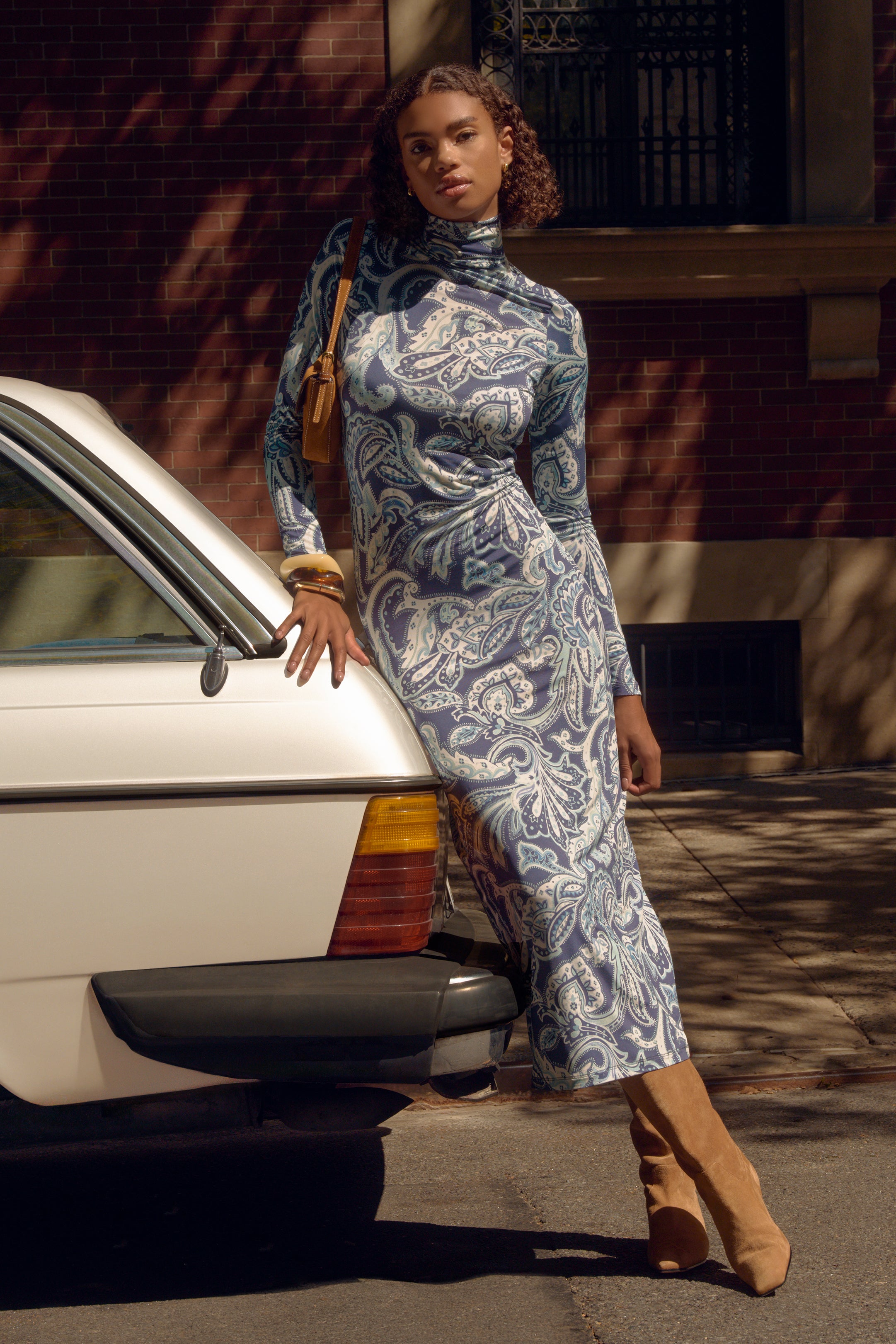 One of our customers' favorite seasonal silhouettes, this figure-skimming turtleneck dress is crafted in a soft jersey knit that enhances Paxton’s elegant lines. Pictured here in Harmony, an updated paisley, the slip-on style feels both contemporary and timeless. The soothing blue-and-white palette brings a sense of confidence and calm to your winter wardrobe, a welcome shift after the holiday whirl.