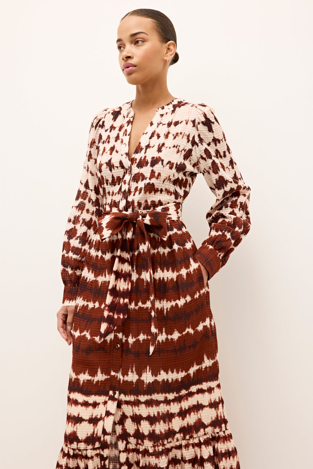 Breeze into lunch dates with the girls or add to the artistic elegance at an event with the sumptuously sophisticated Perrin dress. Pleated and tiered details cascade down its length, while a drawstring waist allows for a more personalized fit. A color-soaked Brick red silhouette adds to the autumnal appeal, and you’ll find yourself slipping into this supersoft and drapey highlight of the season week after week.