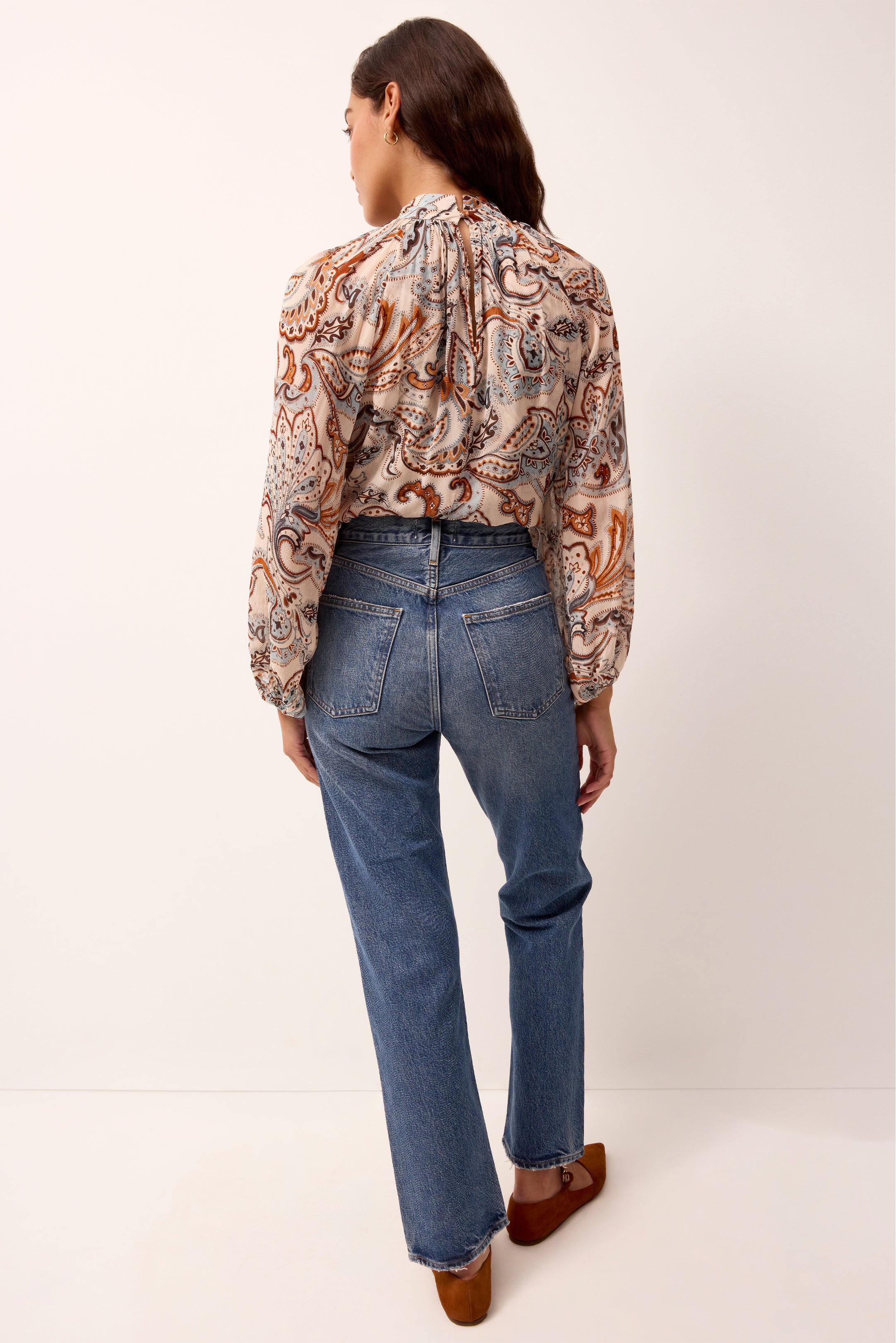 Scottie’s sheer raglan sleeves, stylish stand collar, and an elegant crinkle chiffon fabric create a captivating canvas for our new Trinity print, a feminine paisley in a creamy color palette. Tuck Scottie into a pair of straight blue jeans and flats for the perfect winter weekend look.