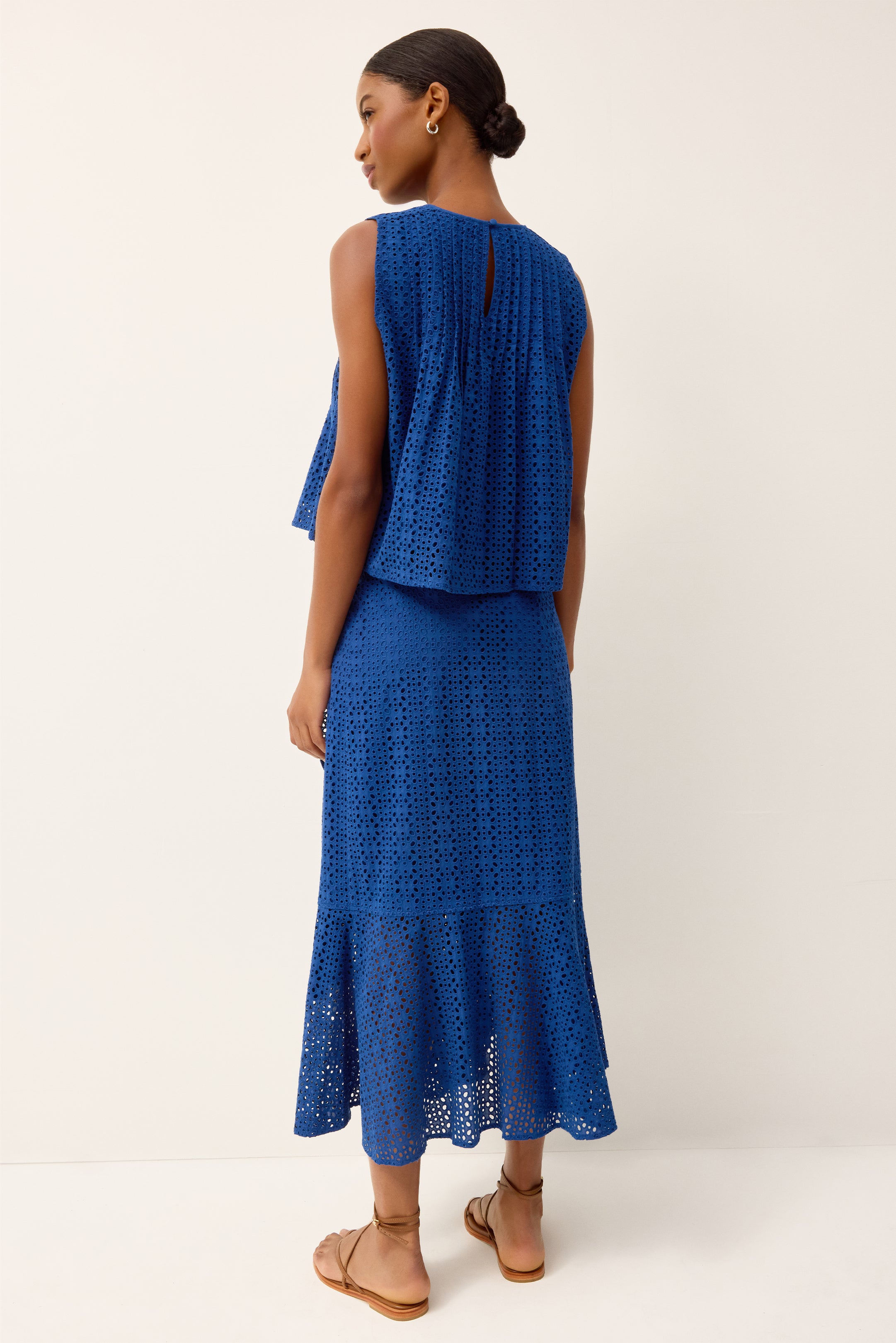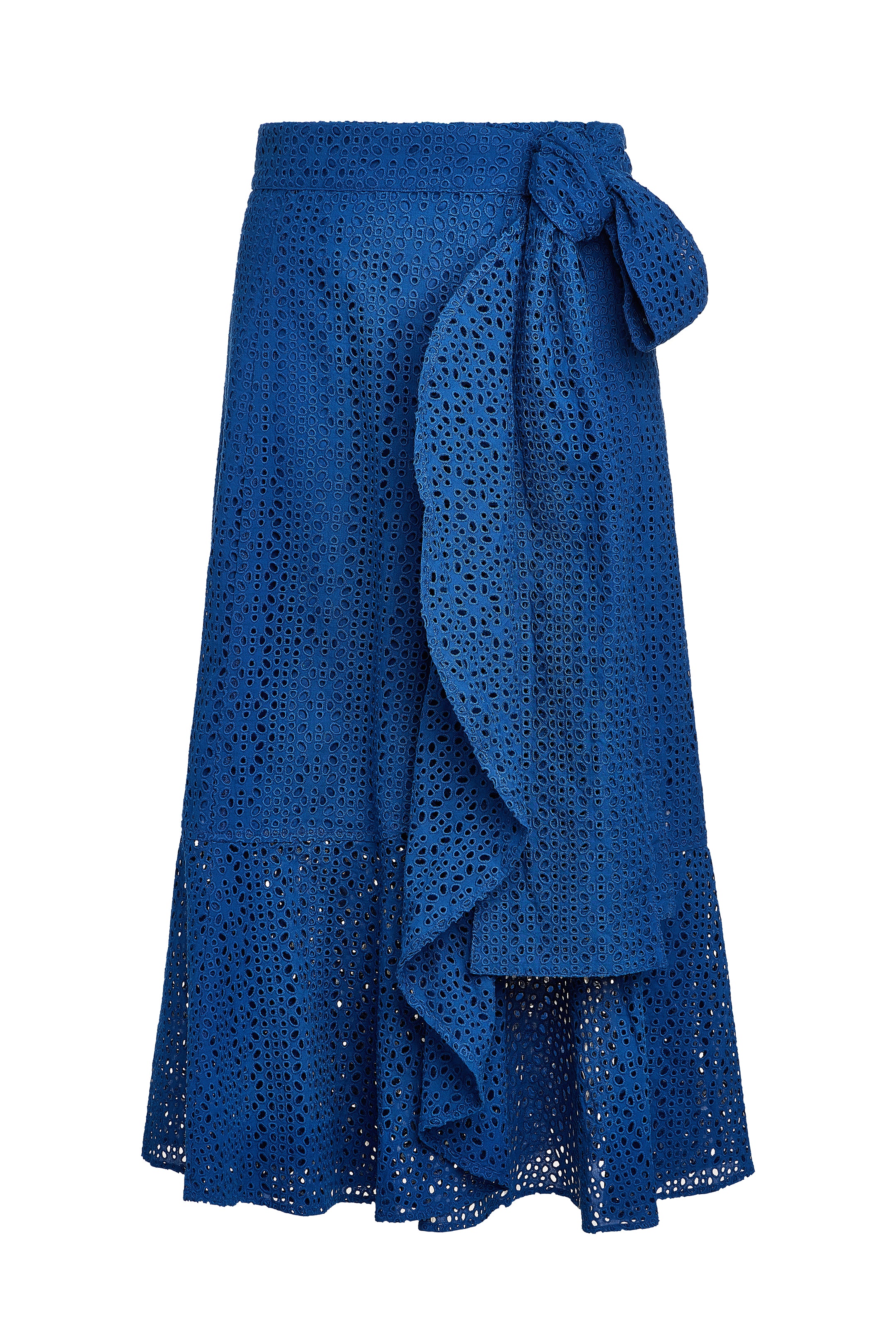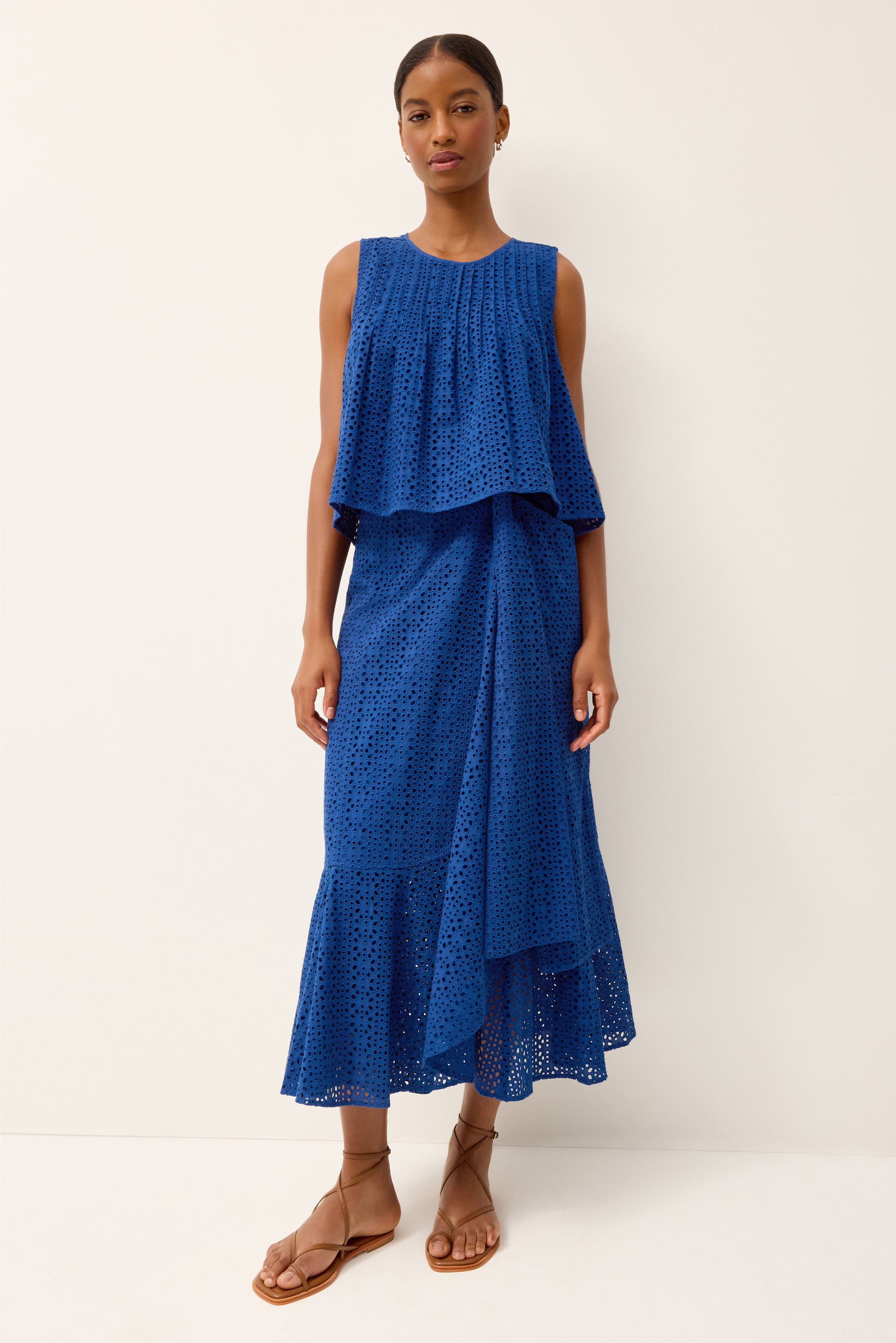 For the lover of volume, Teresa is a dramatic update to our best-selling Estine wrap skirt. The A-line silhouette is crafted in eyelet and features a cascading ruffle that adds movement and shape, while adjustable ties allow for an easy, flexible fit. In Admiral, it’s a bold yet wearable skirt that brings depth and dimension to warm-weather dressing.