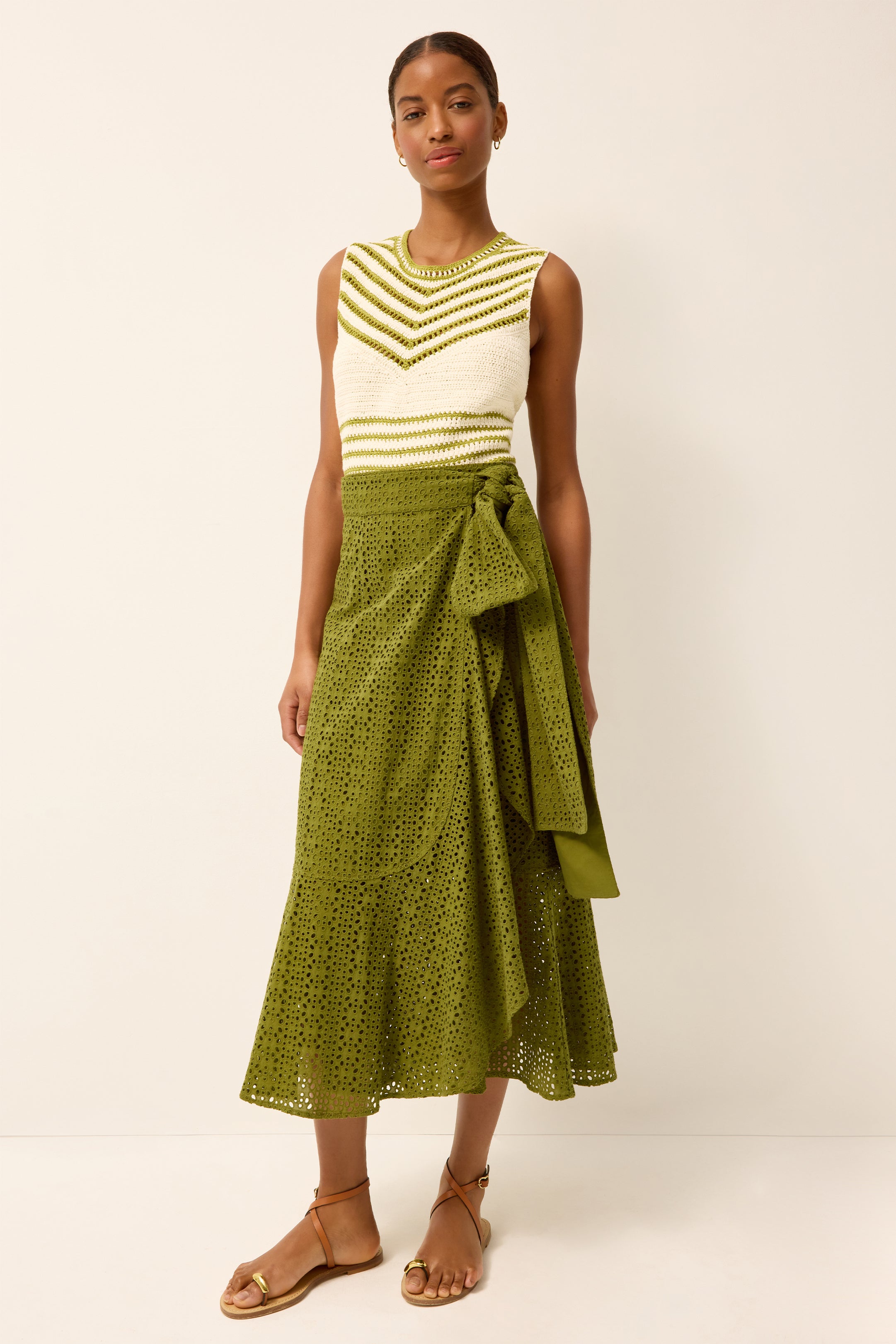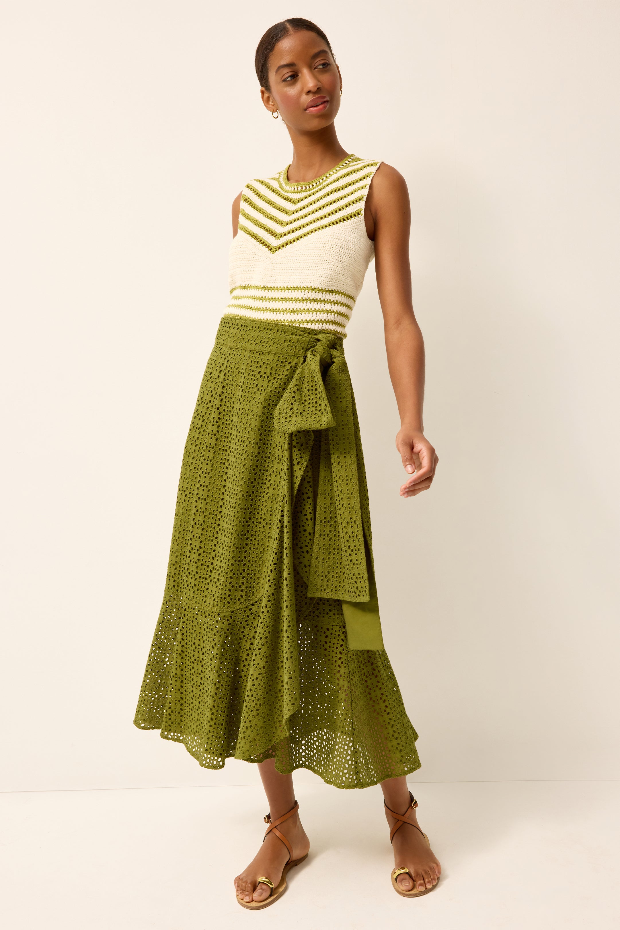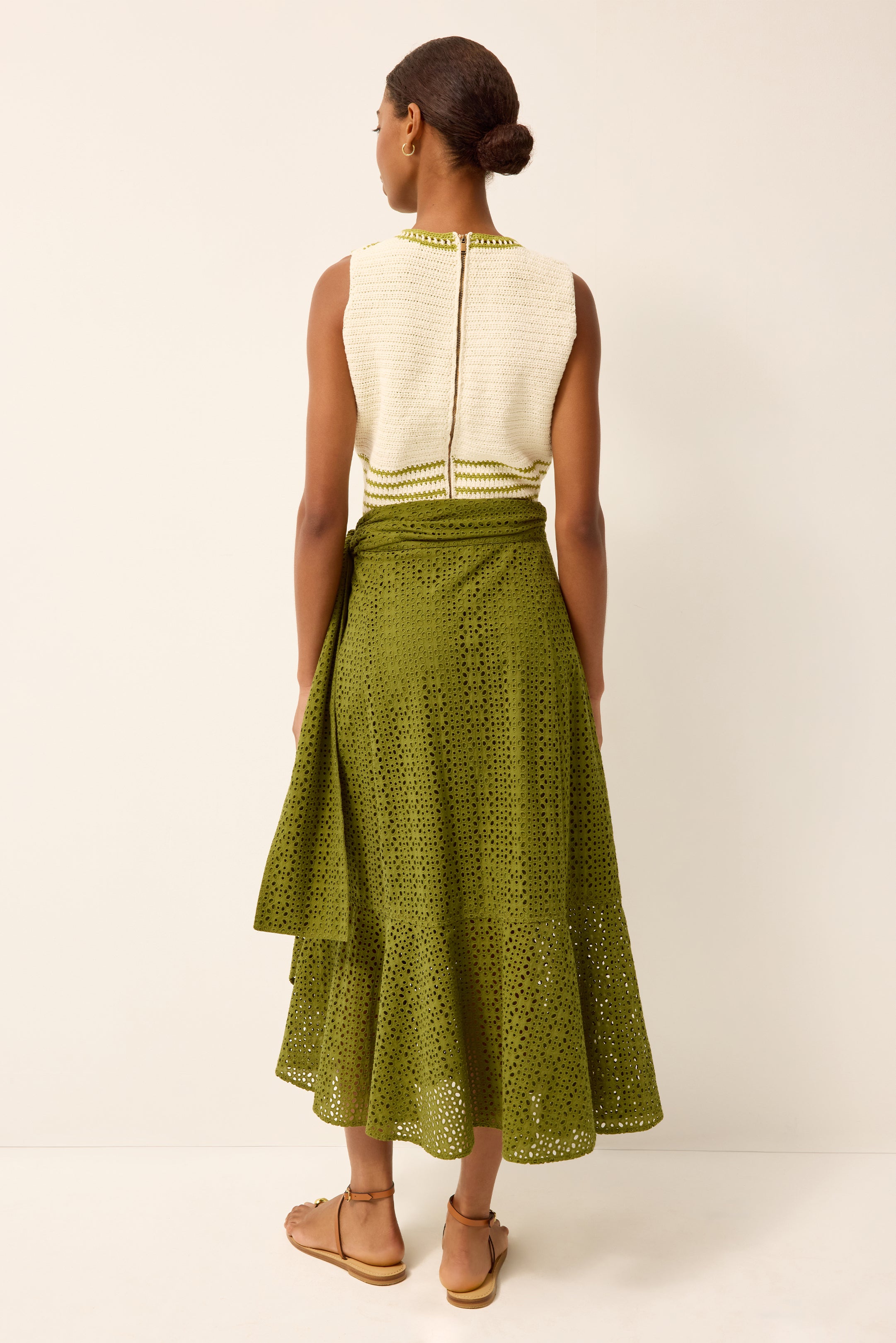 For the lover of volume, Teresa is a dramatic update to our best-selling Estine wrap skirt. The A-line silhouette is crafted in eyelet and features a cascading ruffle that adds movement and shape, while adjustable ties allow for an easy, flexible fit. In Ivy, it’s a statement skirt that feels bold, feminine, and effortlessly wearable.