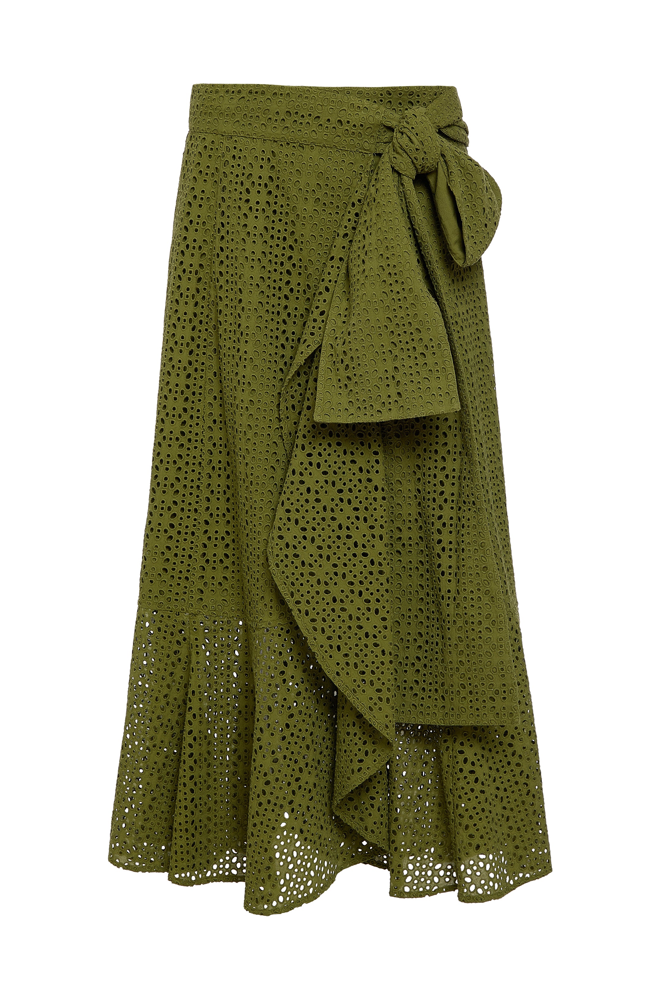 - A-line wrap skirt with flounce ruffle along edge