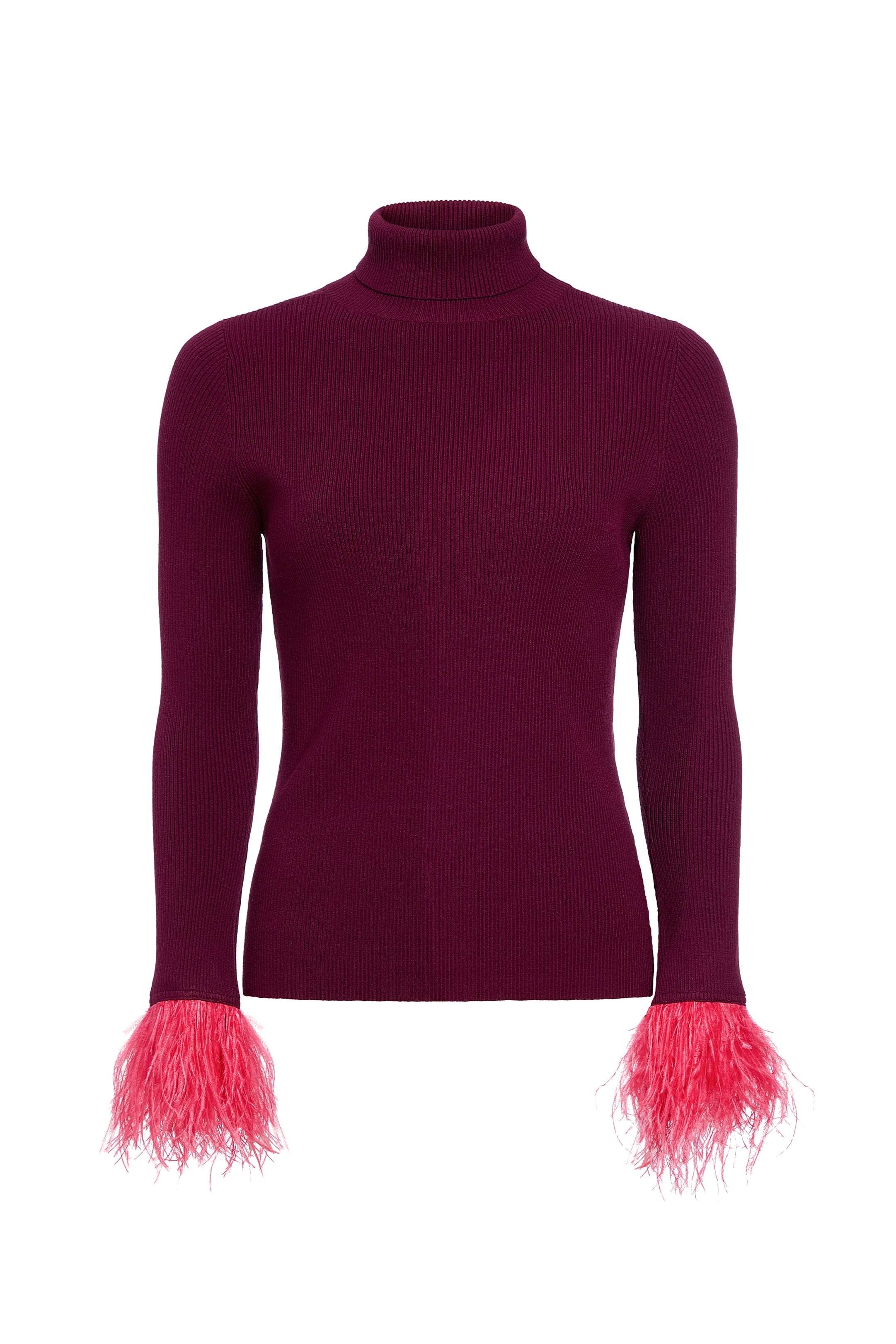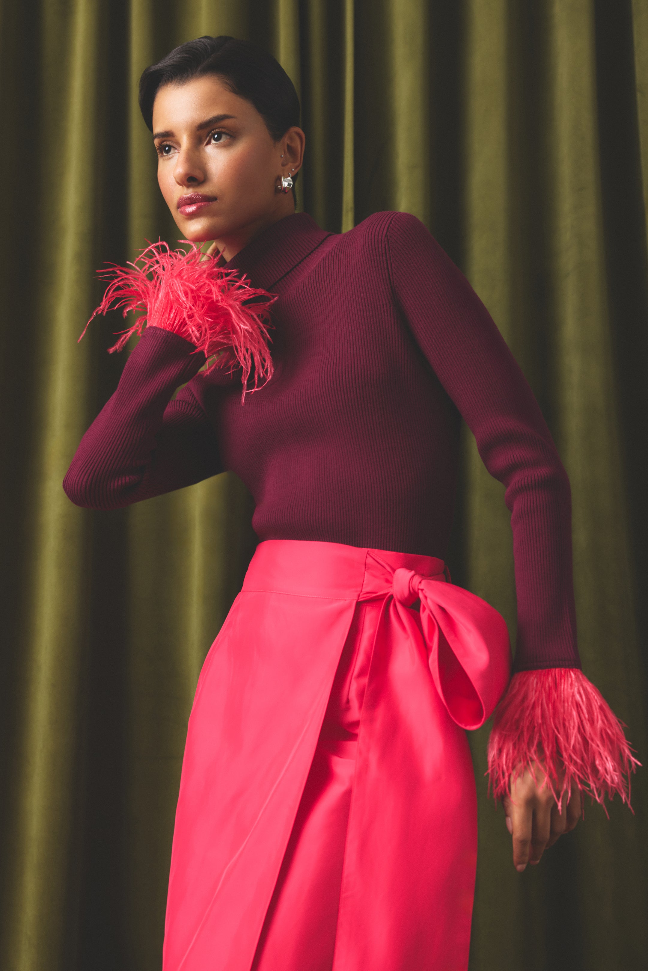 Meet Tucker, a classic turtleneck reimagined for the holidays with flirty feather-trimmed cuffs. The ribbed, form-fitting silhouette is the kind of layering piece holiday capsule wardrobes are built around. For full glamour wear it with the cerise Georgina wrap skirt.