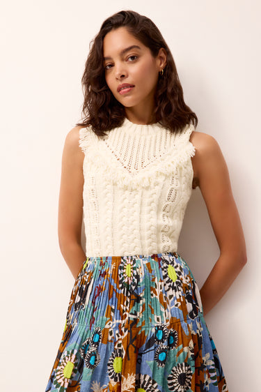 Meet your new transitional wardrobe workhorse. This standout knit features flattering fringe detailing along the front and back, adding texture and a hint of Western flair. It’s the perfect counterpoint to bold, patterned separates, including the Wilson skirt in our meandering Oasis print.