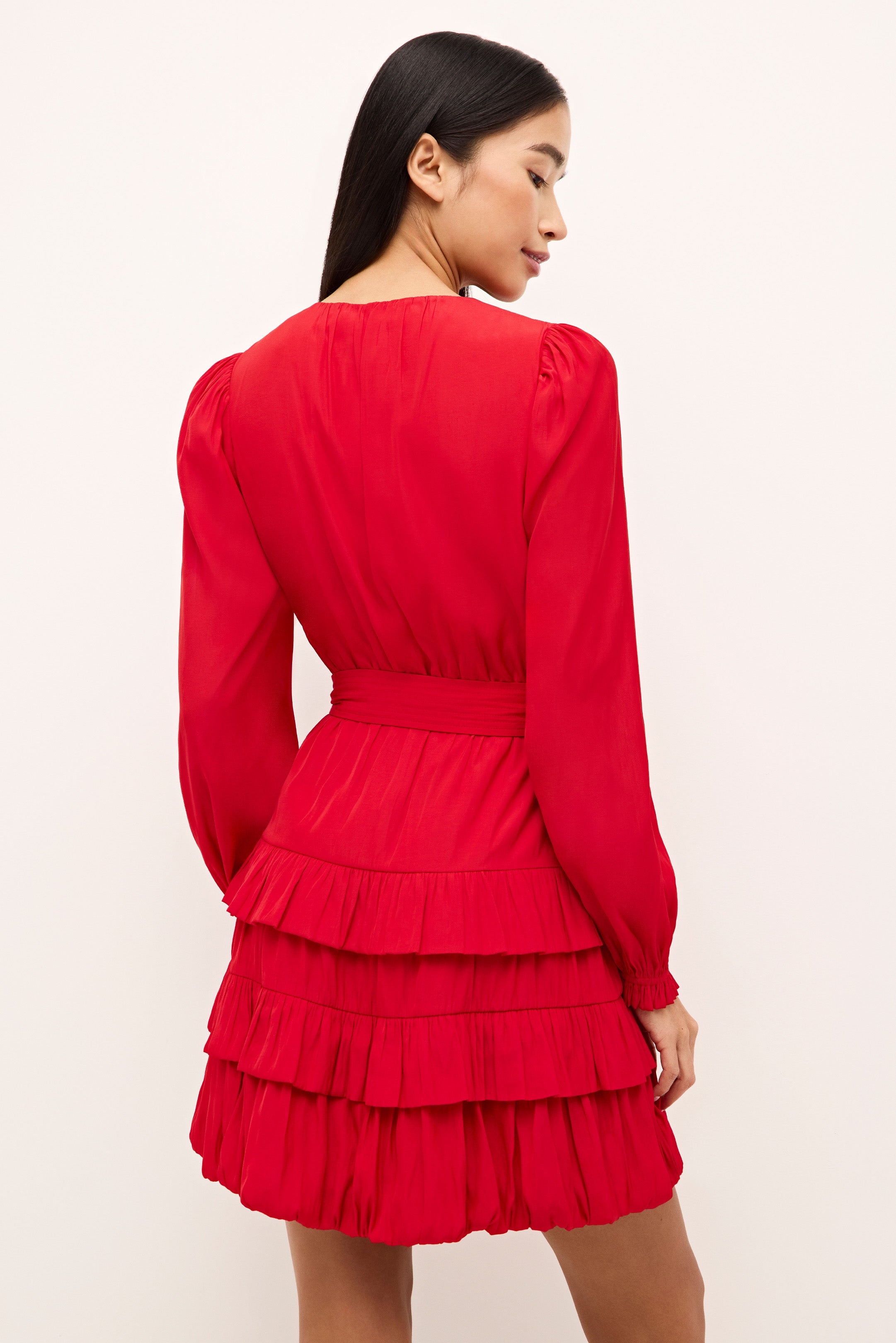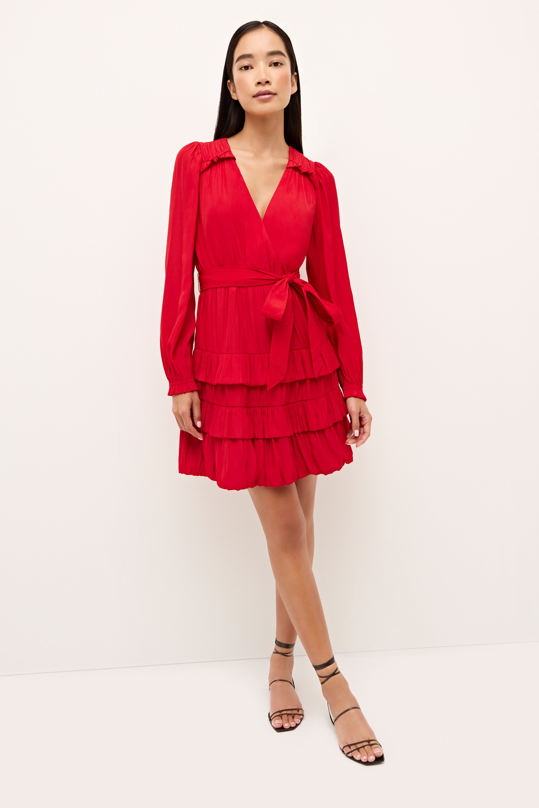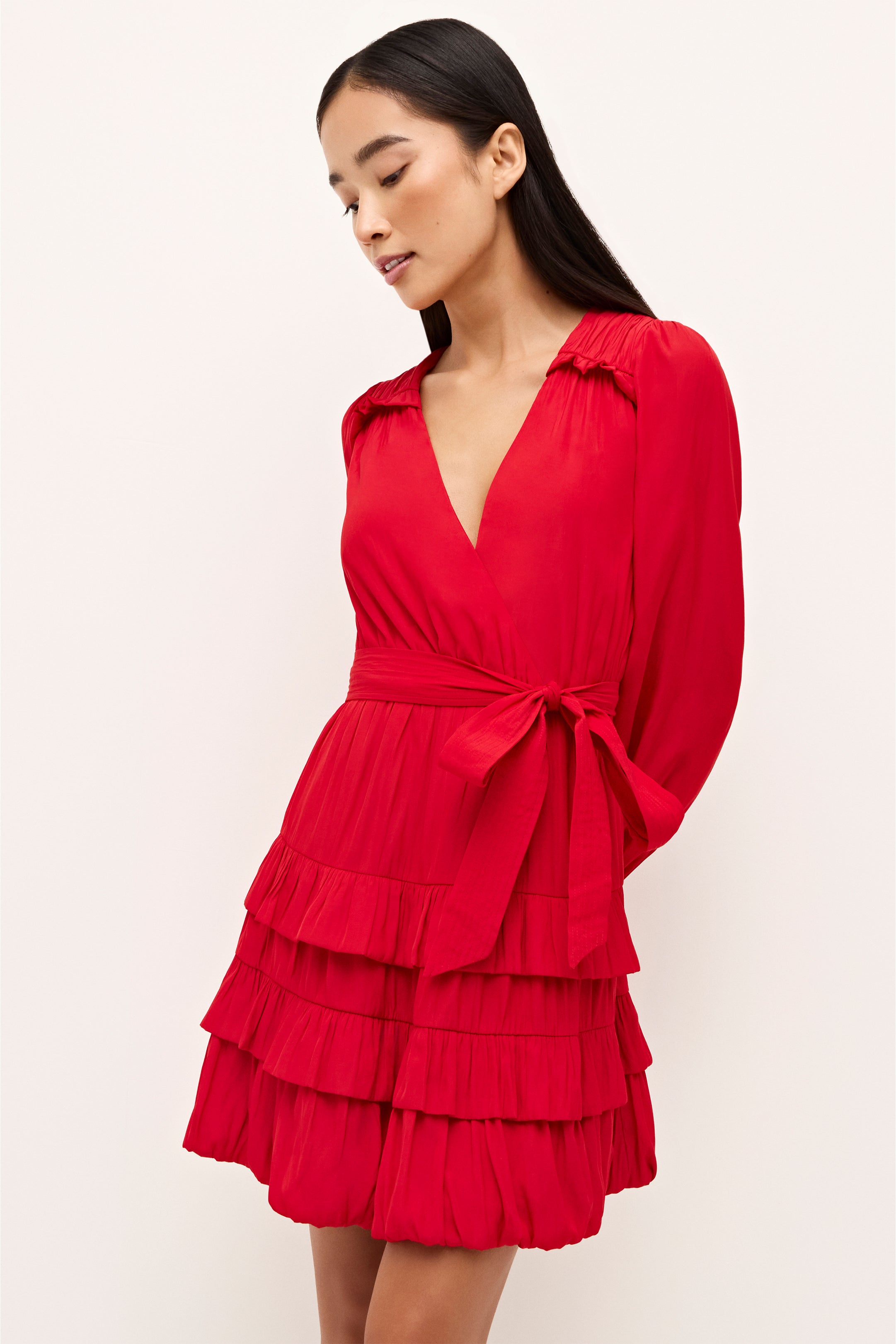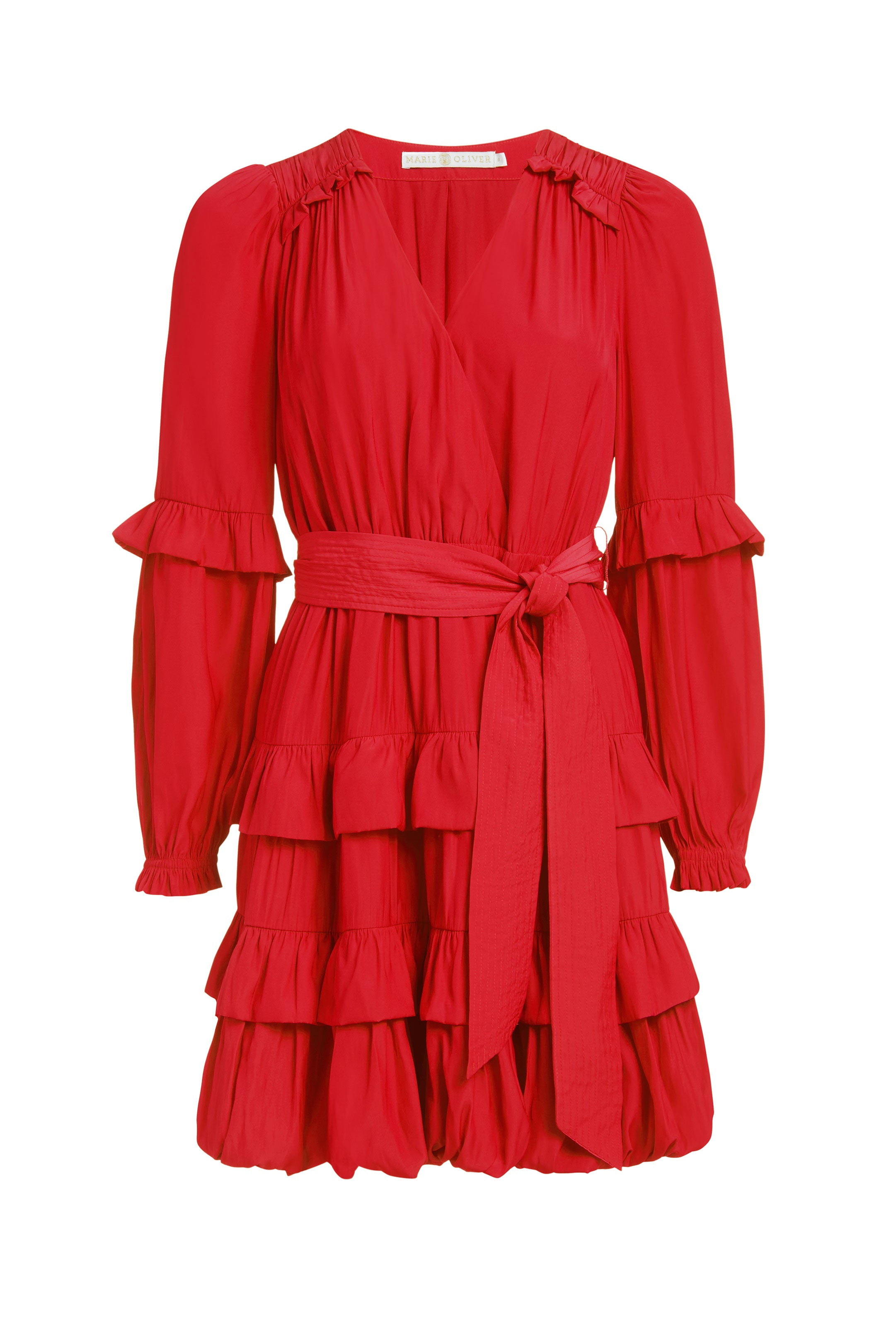 Inspired by our Cove and Mila dresses, Wynona is her own woman, featuring a gathered yoke, crossover v-neck, ruffles along the skirt, optional tie belt, and swingy bubble hem. She comes in a holiday-perfect Peppermint red this season.