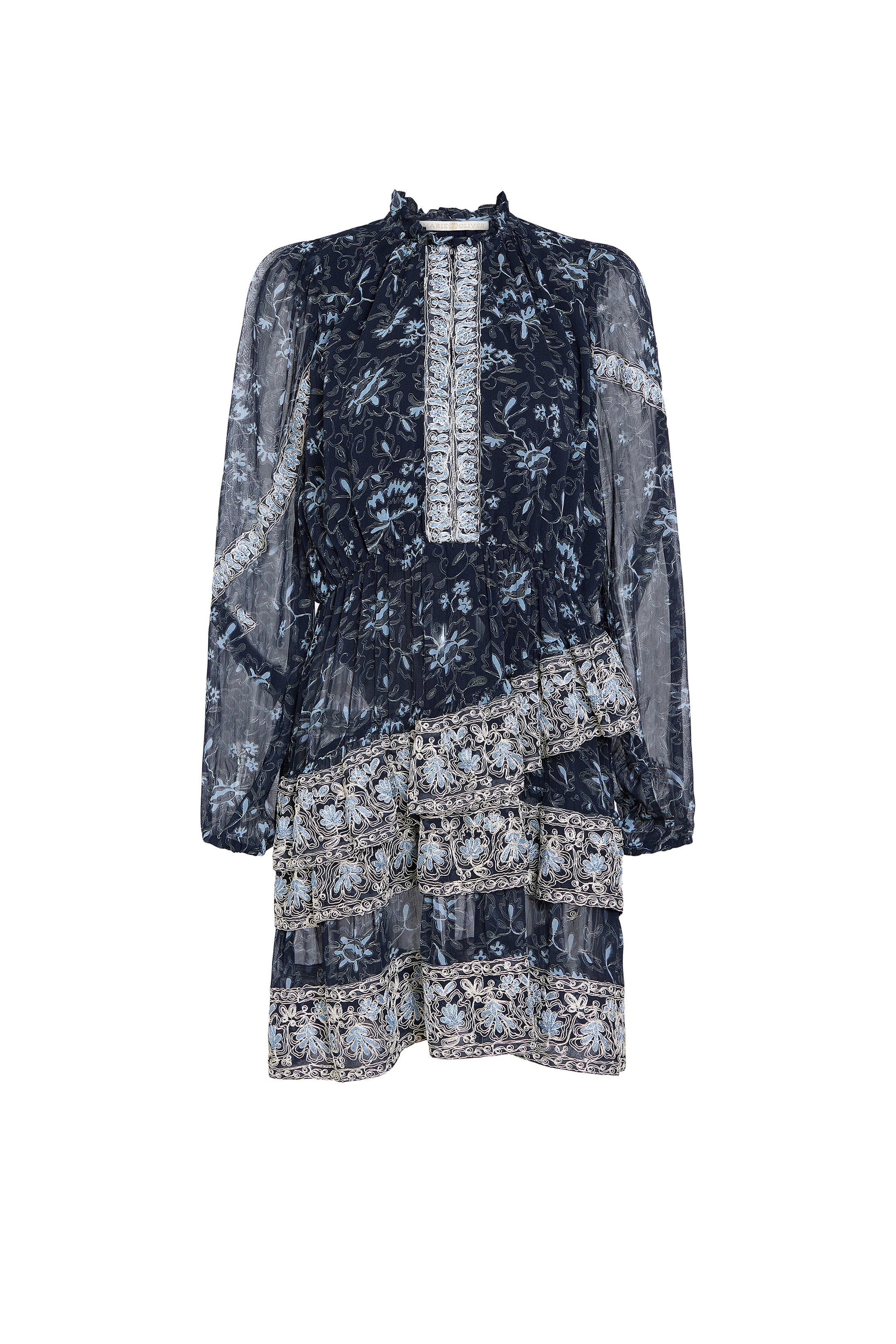 Meet Jazmine, the long-sleeve mini defined by puffed sleeves, a ruffled neckline, and lace-inspired detailing along the shoulders, sleeves, placket, and tiers. Its soft blue and white ditzy floral makes the silhouette endlessly adaptable for everything from leisurely post-holiday brunches to impromptu warm-weather escapes.