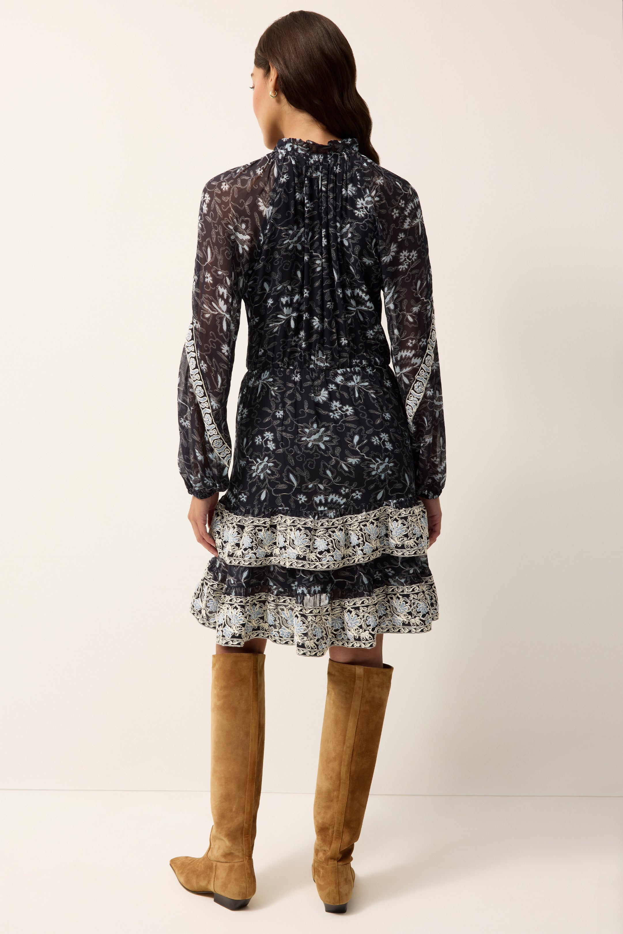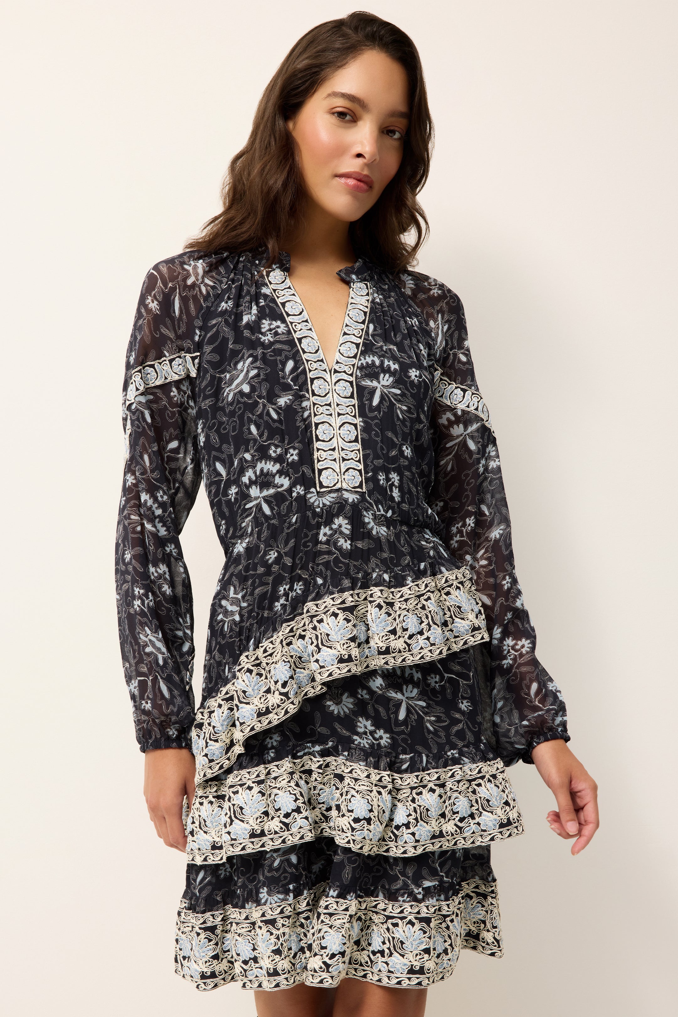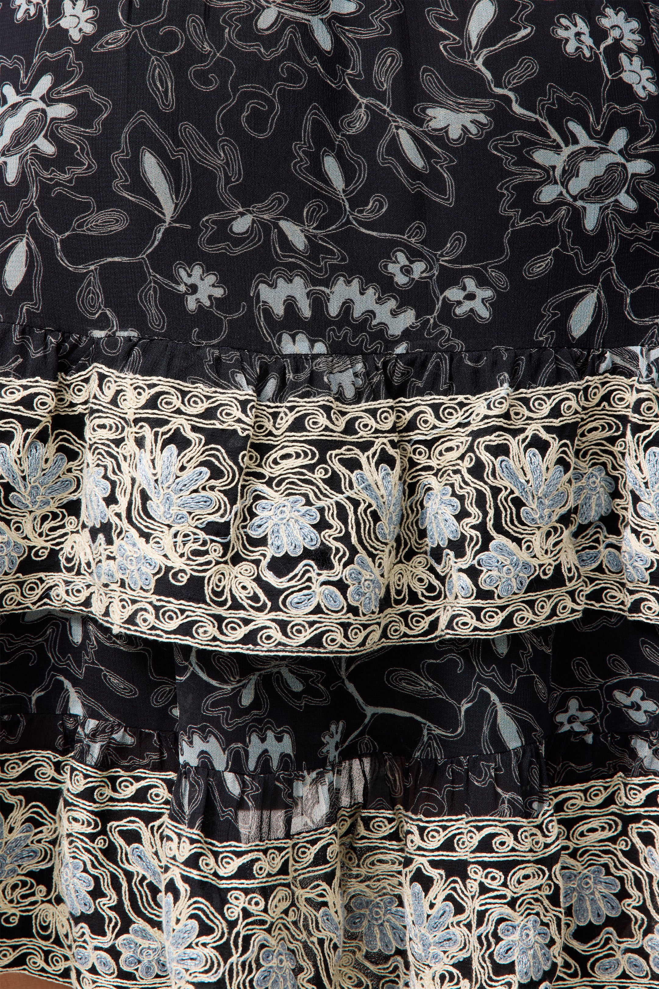 - Embroidery detail along shoulder, sleeves, placket, and skirt tiers