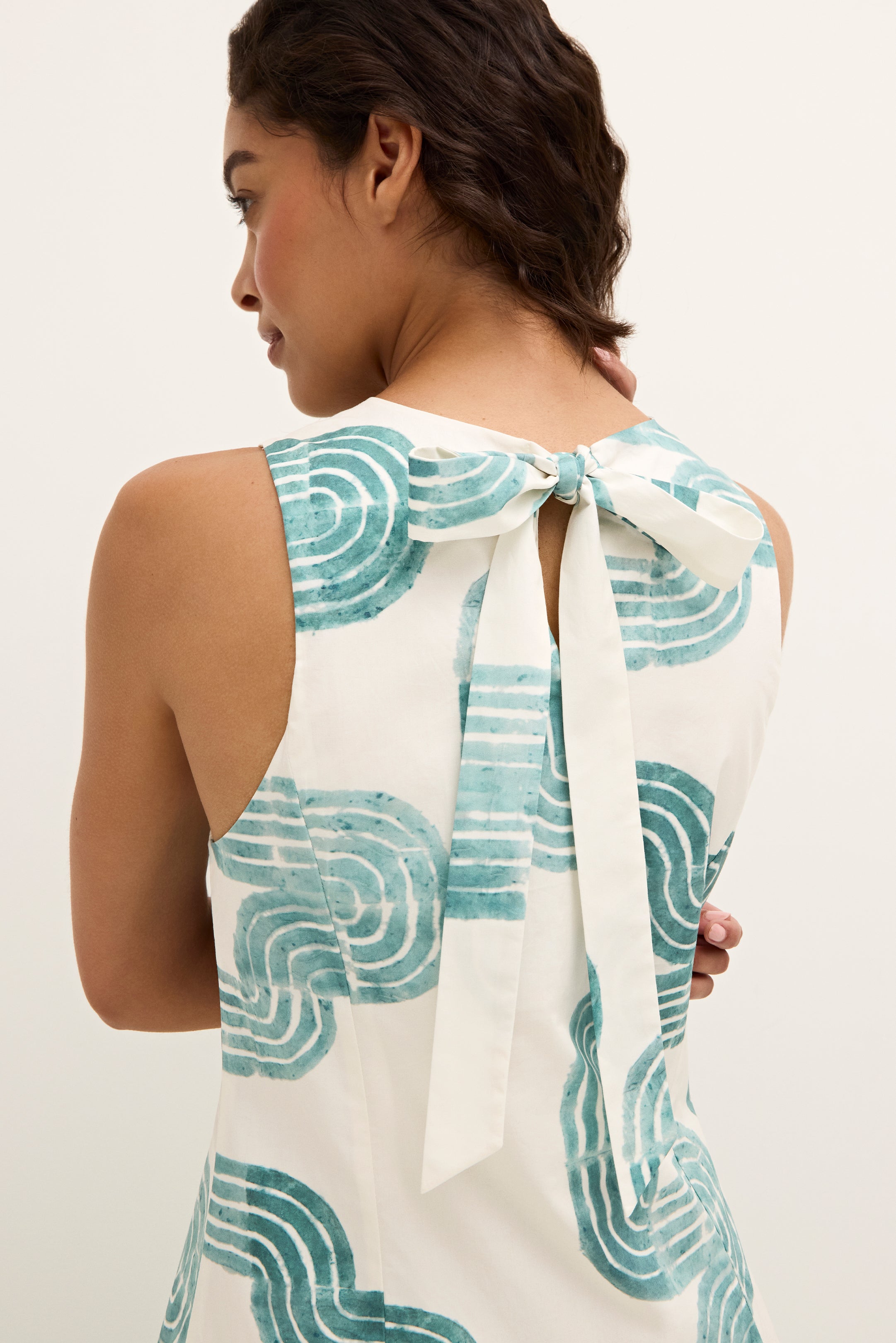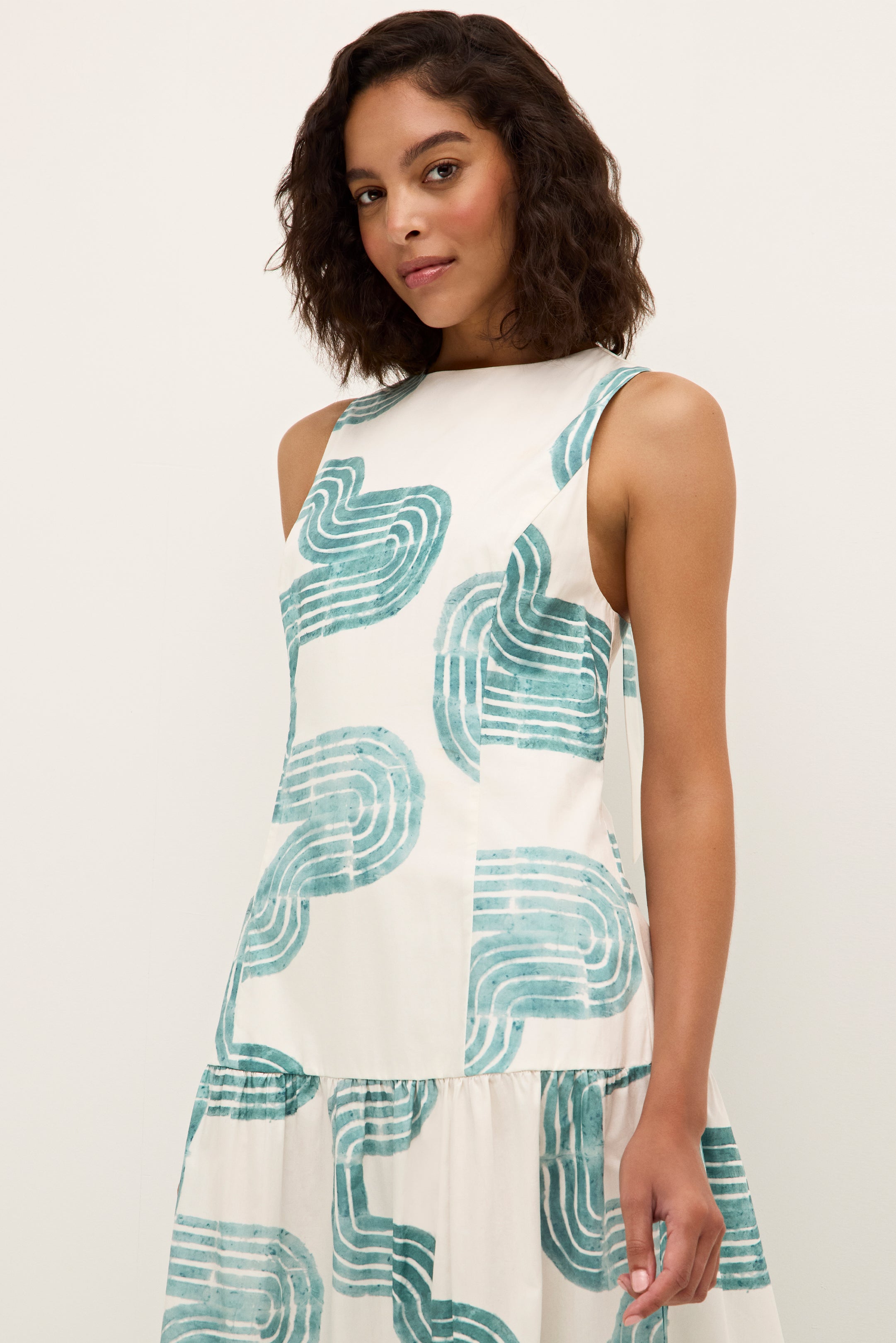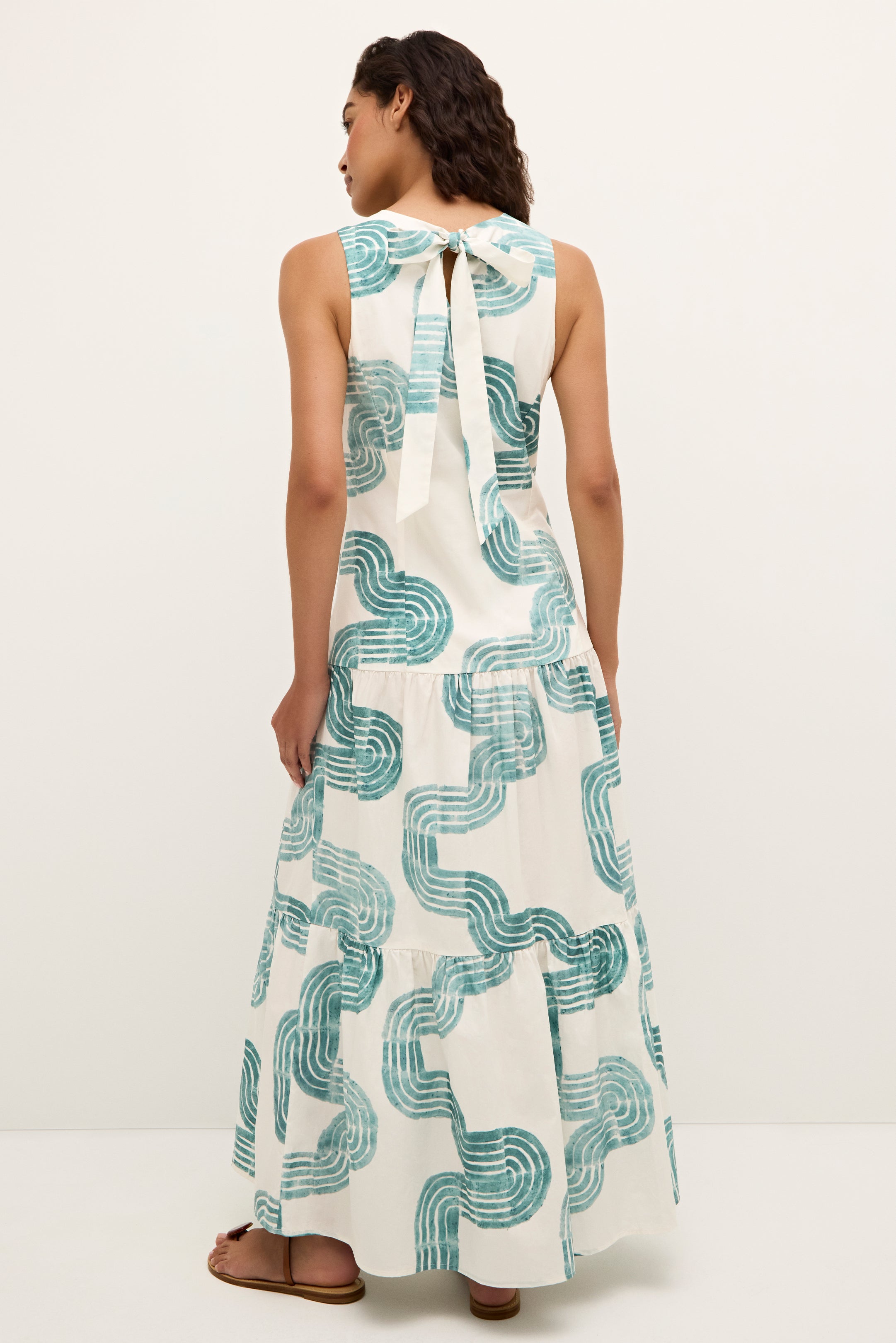 Cut from a breezy cotton poplin, our new Zelda maxi features the same elegant drop waist and a pretty bow-back as our Marilyn mini—and all the glamour of its Jazz Age namesake. Zelda is pictured here in our new Nile pattern, a stamp-effect geometric in turquoise and white.
