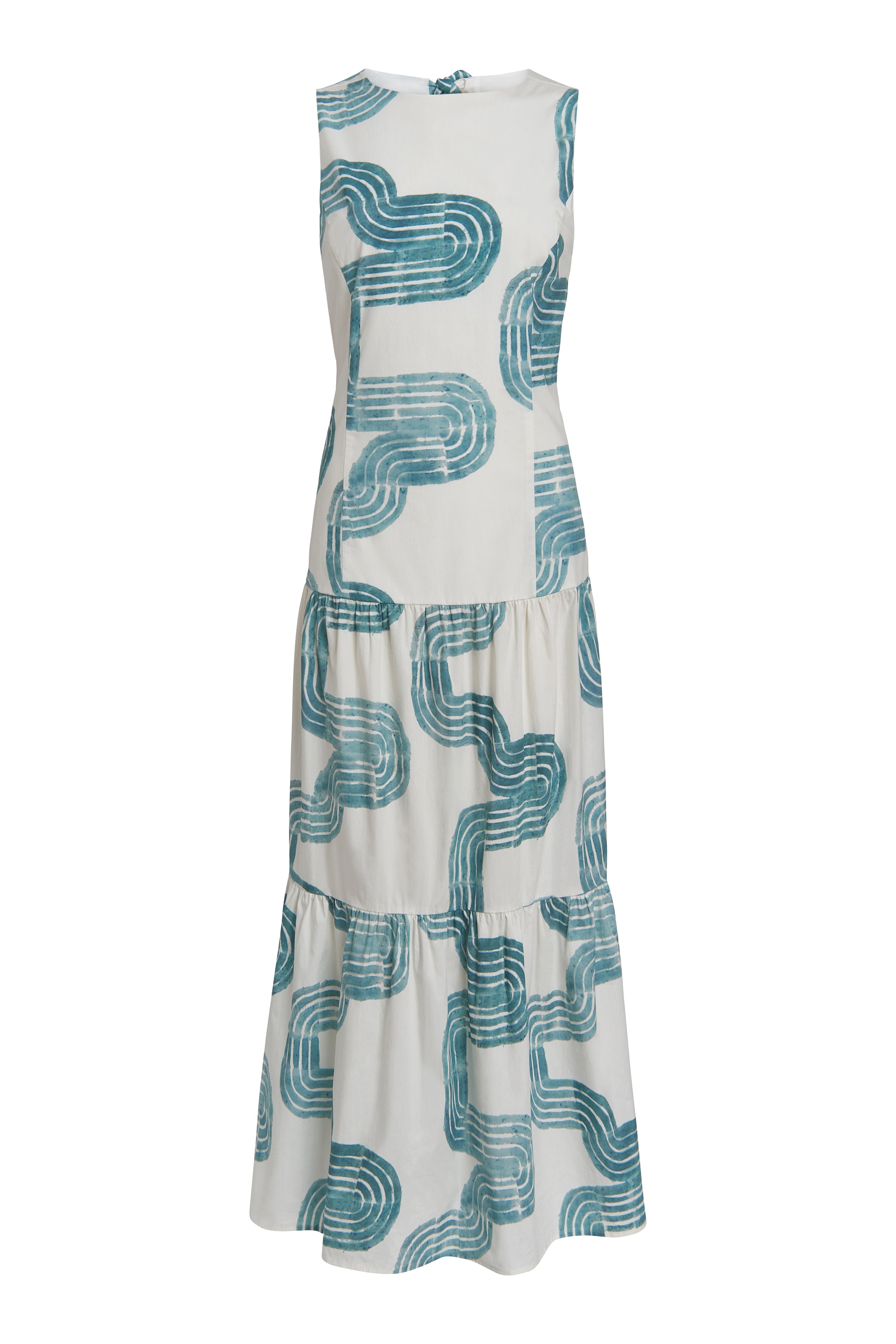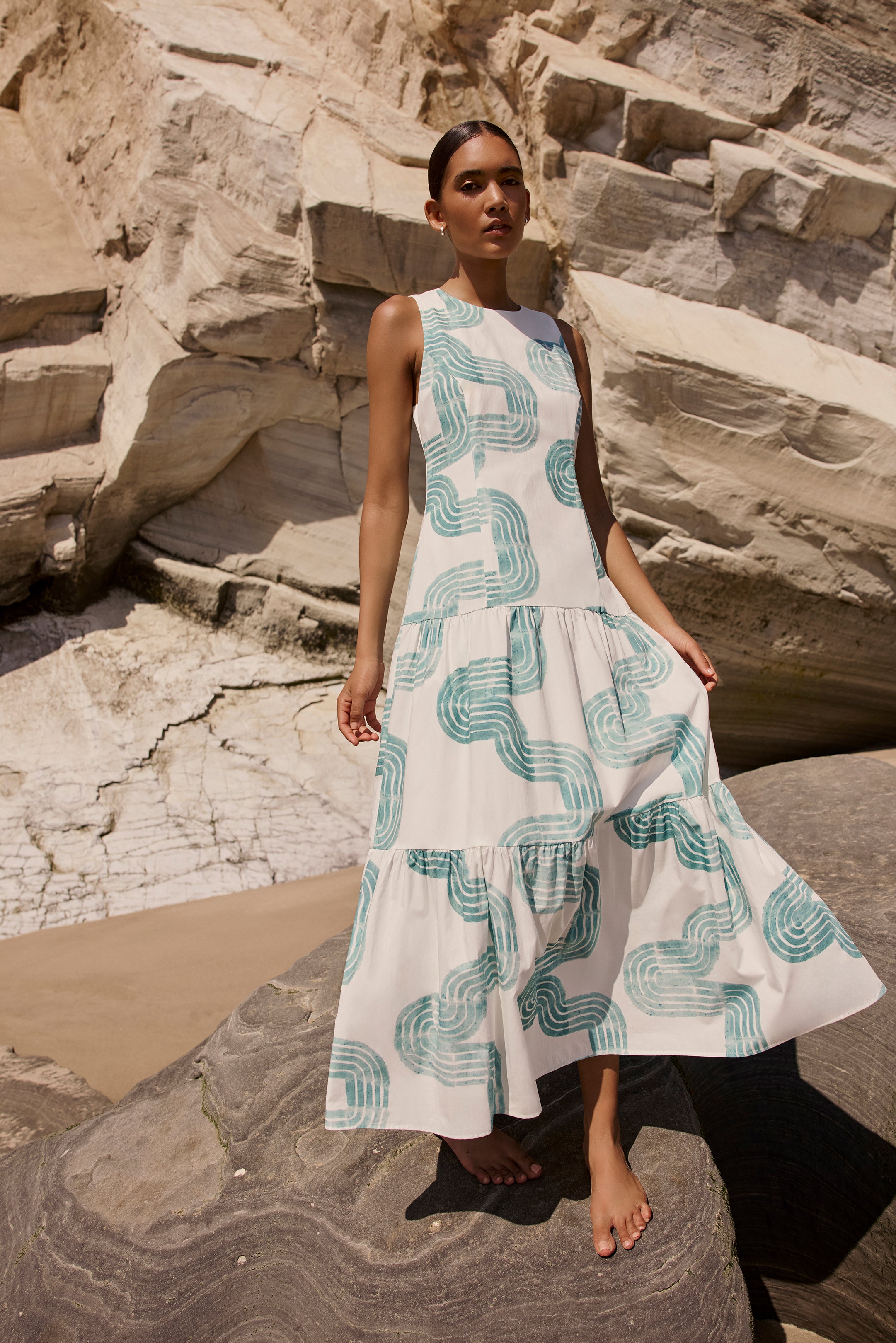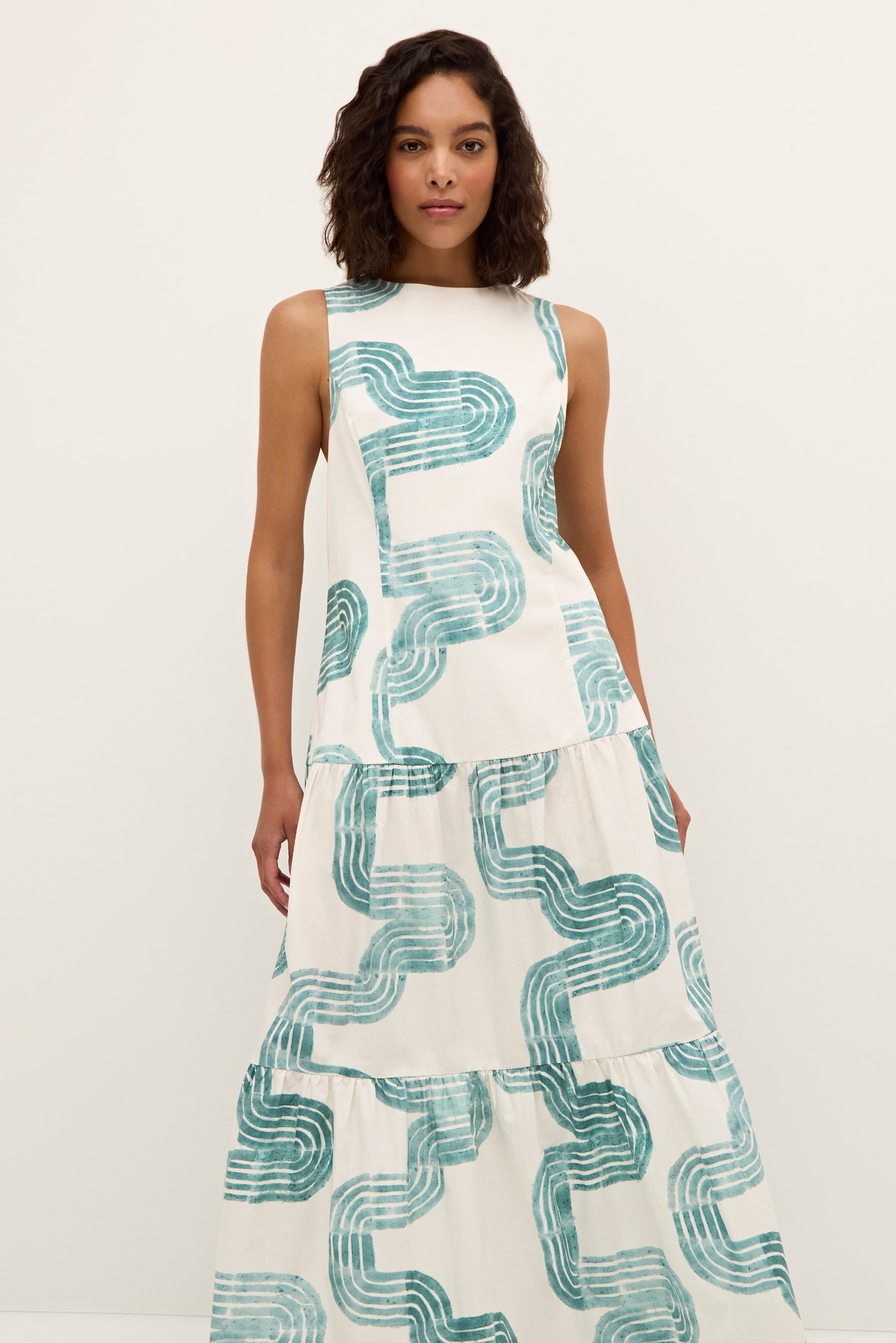 Cut from a breezy cotton poplin, our new Zelda maxi features the same elegant drop waist and a pretty bow-back as our Marilyn mini—and all the glamour of its Jazz Age namesake. Zelda is pictured here in our new Nile pattern, a stamp-effect geometric in turquoise and white.
